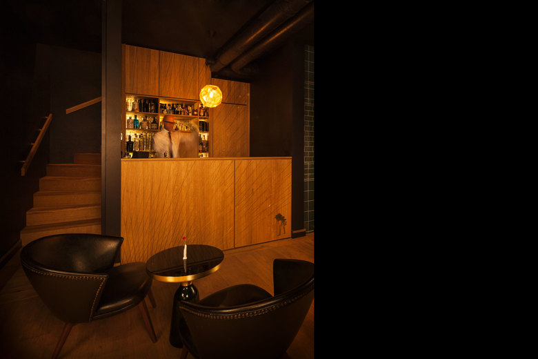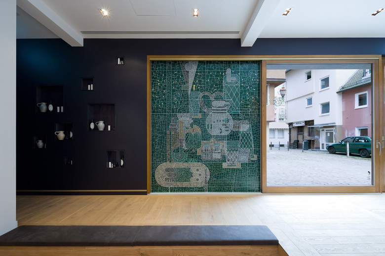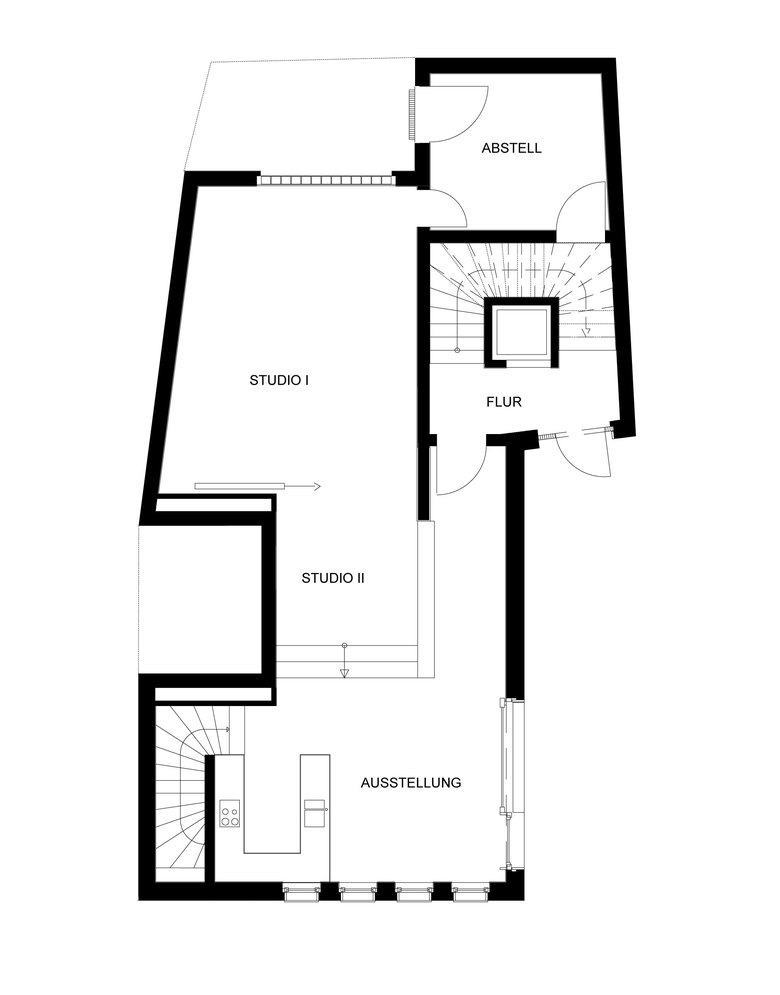 Im Erdgeschoss befindet sich das Herzstück des Hauses: ein Raum für Happenings 2.0. Dieser besteht aus dem Fotostudio mit Ausstellungsräumen übergehend in eine offene Küche. Räumlich sind die beiden Bereiche über einen abgestuften Ebenenversatz mit eingelassener Sitzgelegenheit verbunden. Im Keller liegt eine Bar mit sichtbarer Apfelweinkelterei. In der Kleinen Rittergasse 11 verschmelzen privater und öffentlicher Raum. Die Bewohner mischen sich mit der Stadtbevölkerung. Es entsteht ein Community Space. Partizipativ und lässig exklusiv.