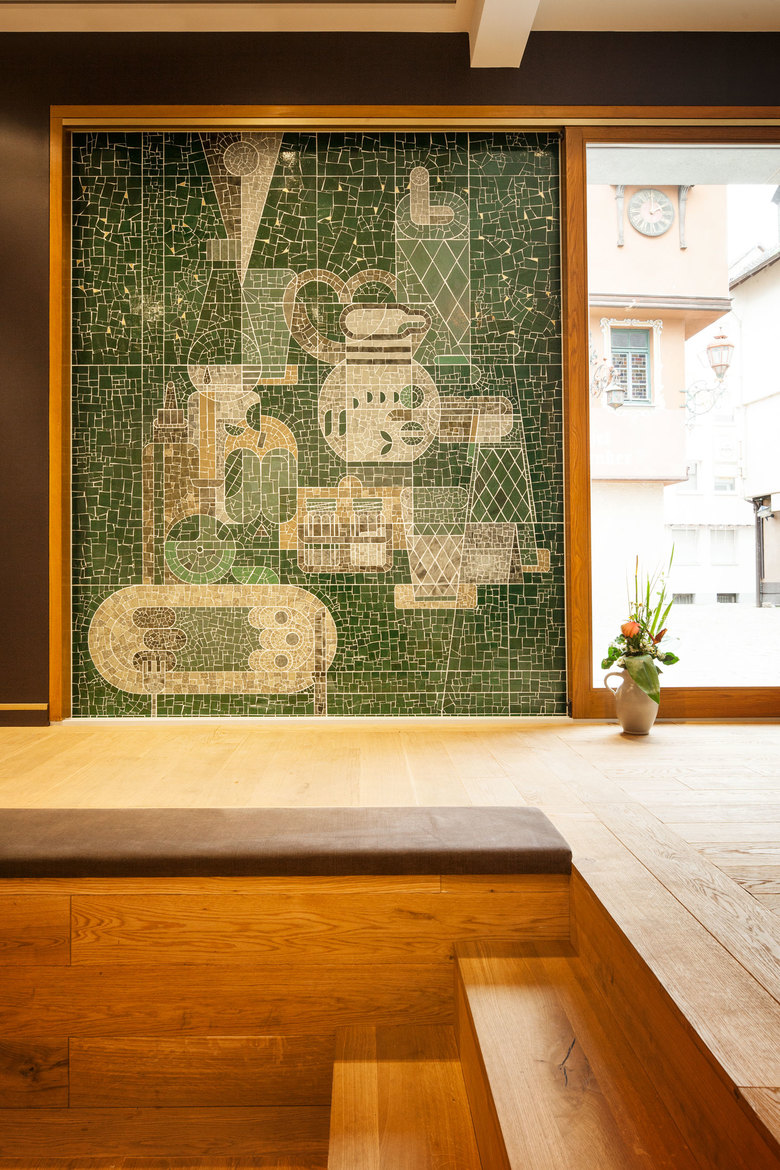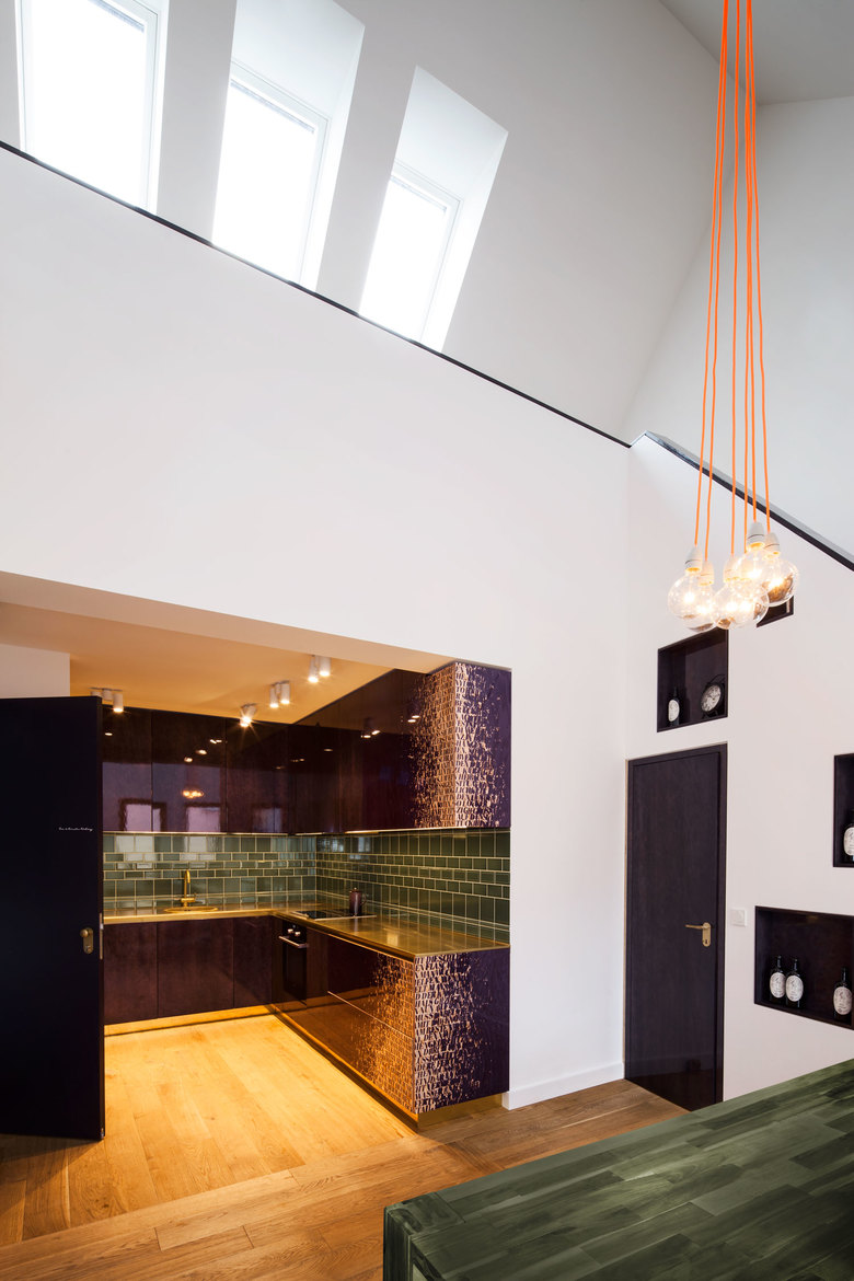 Text spielt auch im Interior Design des Gebäudes eine Rolle. Im ersten Musikvideo der Popgeschichte - Bob Dylan`s Song „Subterranean Homesick Blues“ steht der Sänger in New York und blättert begleitet zum Song handschriftliche Fragmente des Liedtextes herunter. In der dunkellila Oberfläche der beide Wohnungen komplett ausstattenden Einbaumöbel ist der Text dieses Songs in einer selbst programmierten Verfremdung und Überlagerung als negatives Grafitti ausgespart. Der Text wechselt erneut das Medium vom Lied zur Schrift im Video, zum Text im Programm und zur Schrift auf der Oberfläche. Das leitmotivische Interior Thema kreist jedoch um einen zeitgenössisch interpretierten Arts and Crafts Chic. Dieser inszeniert sich in Details wie beispielsweise dem in Holzoberflächen mit Messing eingelassenen typischen „Gerippte“ Rautenmuster von Apfelweingläsern oder einem Fliesenmosaik mit Bembelmotiv. Durch dieses transformierte Kunsthandwerk mit Lokalkolorit entsteht eine ganz neue Sachsenhäuser „Gemütlichkeit“. Die Materialität und Farbe von Einbauten und Böden in massiver Eiche, dunkelgrüne Fliesen, auberginefarbene Wände und Oberflächen sowie Arbeitsplatten aus unbehandeltem Messing strahlen Wärme in den ganzen Raum aus. Auch die Oberflächen aller Armaturen und Türklinken wurden mit Unterstützung der Firma Galvanik Kreike auf das rohe Messing reduziert und können nun stilecht patinieren.