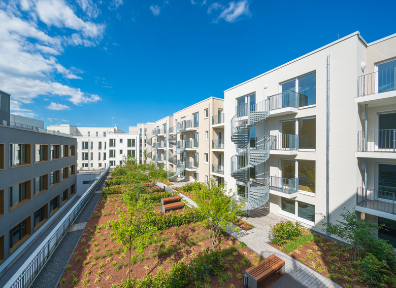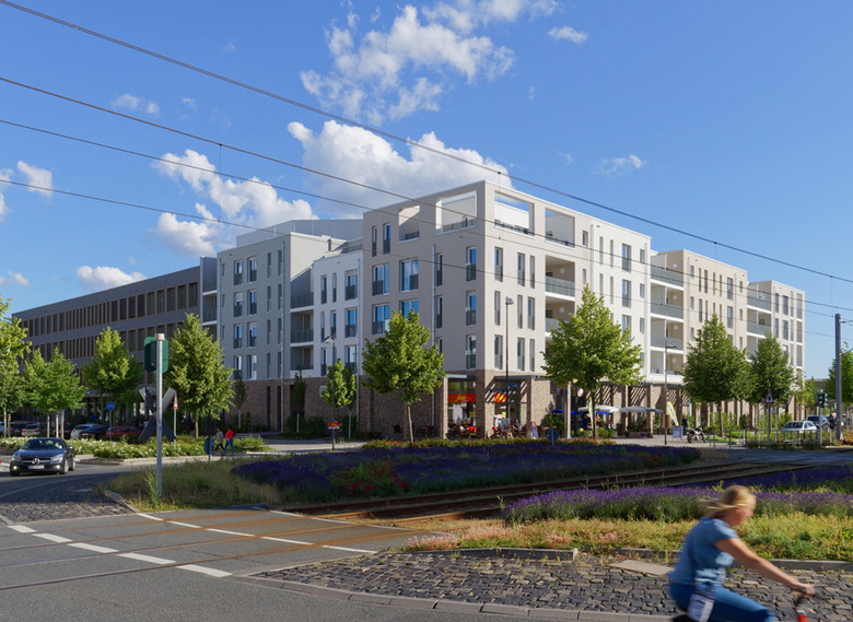 Das Projekt teilt sich in sieben dezent farbig abgesetzte Häuser, dem Erscheinungsbild einer klassischen Lochfassade mit auf ein Raster abgestimmten, wechselnden Fenstergrößen, welche durch filigraner wirkende Zwischenbauten der Loggien verbunden sind. Dadurch ist die Blockrandbebauung aufgebrochen und das Wohn- und Geschäftshaus mit vier Vollgeschossen und einem Staffelgeschoss wirkt elegant, in sich gehalten, ruhig und ordnend. Klinkerriemchen im Sockelbereich der Fassade betonen die Flächen zwischen den Schaufenstern der Ladenebene und vermitteln Hochwertigkeit und Anspruch.