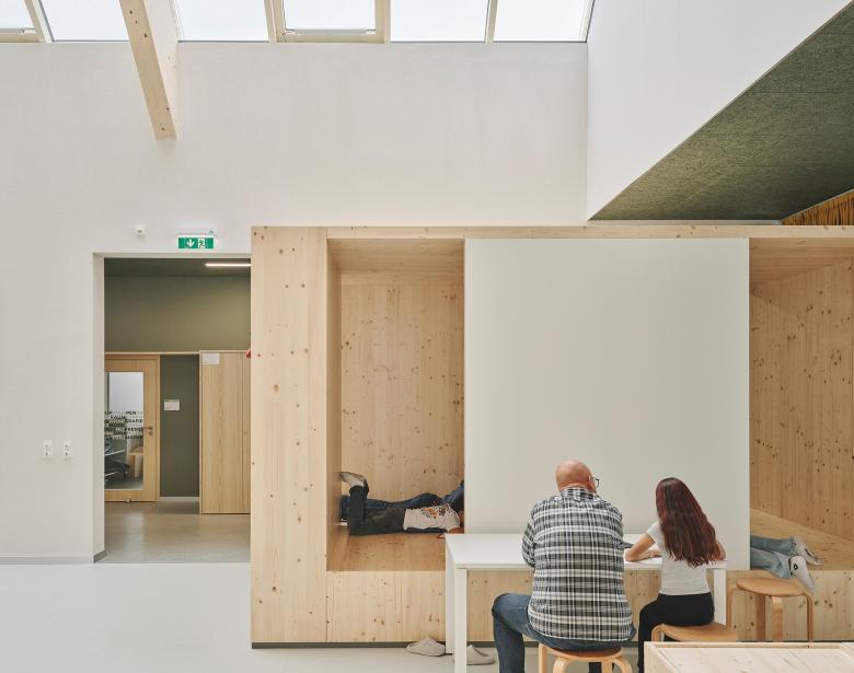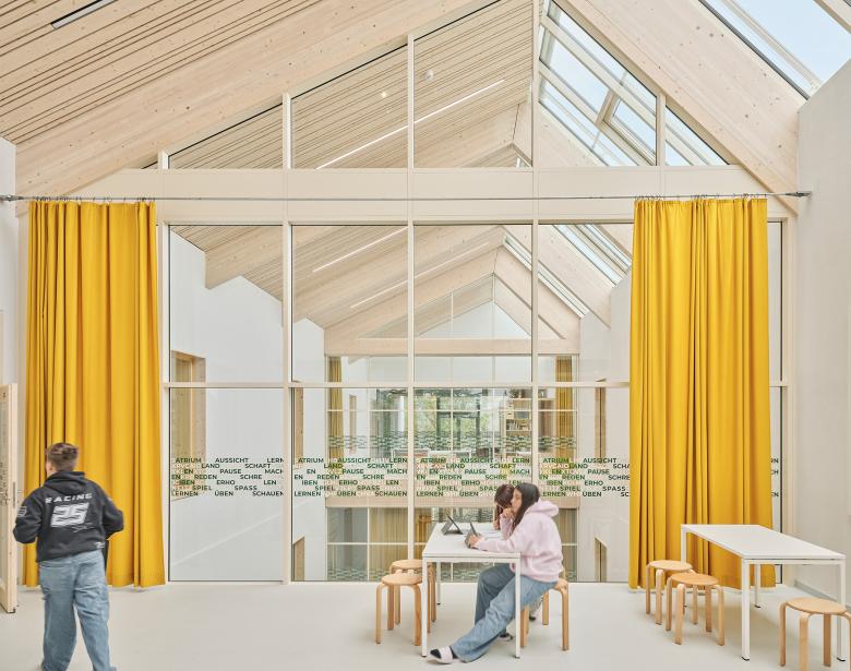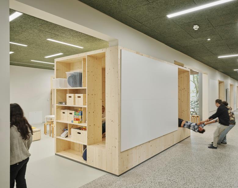 Die beiden bestehenden Klassentrakte stockten wir in Holzleichtbau auf und verbanden sie mit Holzplattformen zu vier Lernclustern. Diese teilen sich jeweils Gruppenräume, Loggien sowie zentrale Lern- und Pausenbereiche. Hochwertige, vielseitig nutzbare Möbel schaffen in den Clustern einzigartige Lernorte. Mit den Holzboxen und ein paar Vorhängen sowie den abwechslungsreichen Räumen, die darum herum entstehen, bekommen die Jugendlichen vielfältige Orte zur Aneignung. Die Fotos von David Schreyer zeigen es, sie sind nötig und sie werden genutzt.