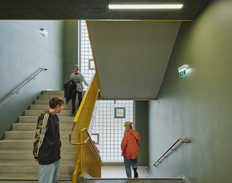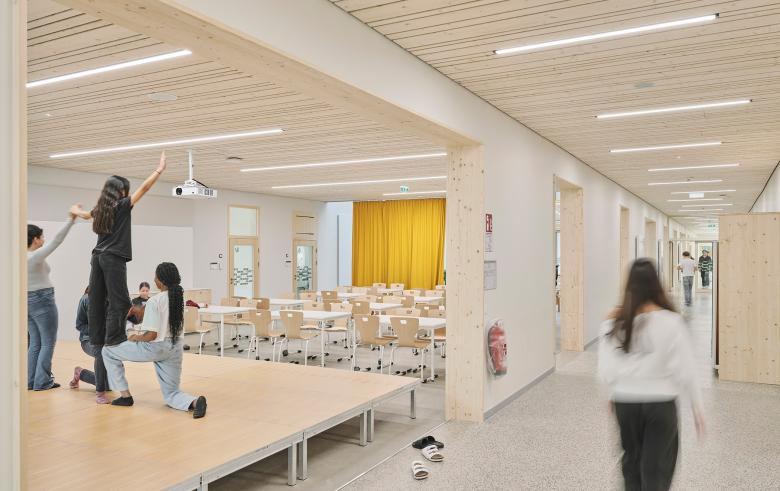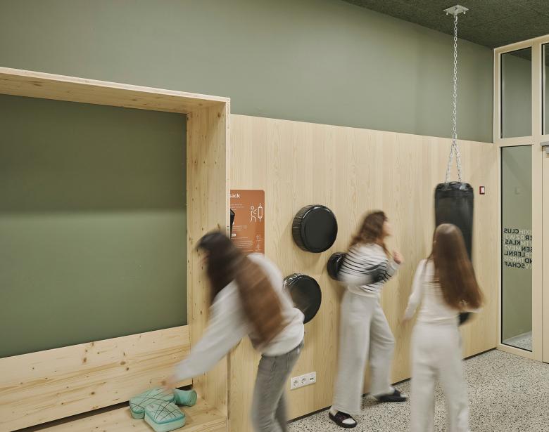 Die zwei Baumskulpturen aus Holz geben dem großen Raum Maßstab und sind eine riesige dreidimensionale Pinwand. Mit der angrenzenden Nachmittagsbetreuung, den Lehrwerkstätten, der Garderobe, Bibliothek und der Direktion ist die Aula der zentrale Treffpunkt für die Mittelschule.
