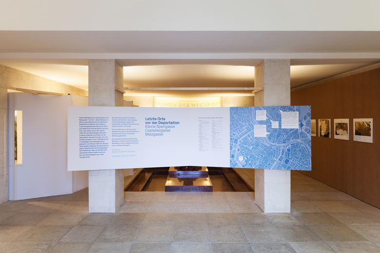 Hier haben sich in den Jahren 1941/42 vier Sammellager befunden, in denen Jüdinnen und Juden vor der Deportation interniert wurden. Von hier wurden Gruppen von je 1.000 Menschen in Lastwägen zum Aspangbahnhof gebracht. Von Februar 1941 bis Oktober 1942 gingen insgesamt 45 Deportationszüge in Ghettos und Vernichtungslager. Der Großteil der mehr als 66.000 österreichischen Shoah-Opfer wurde von den vier Sammellagern aus in den Tod geschickt. Der Weg in die Vernichtung begann mitten in der Stadt. Die Ausstellung zeigt Interviews mit den letzten ZeitzeugInnen dieser Orte und die wenigen Quellen, die Einblick in die Vorgänge in den Sammellagern geben.Der Ausstellungsort, die Krypta des Heldendenkmals, wurde den gefallenen