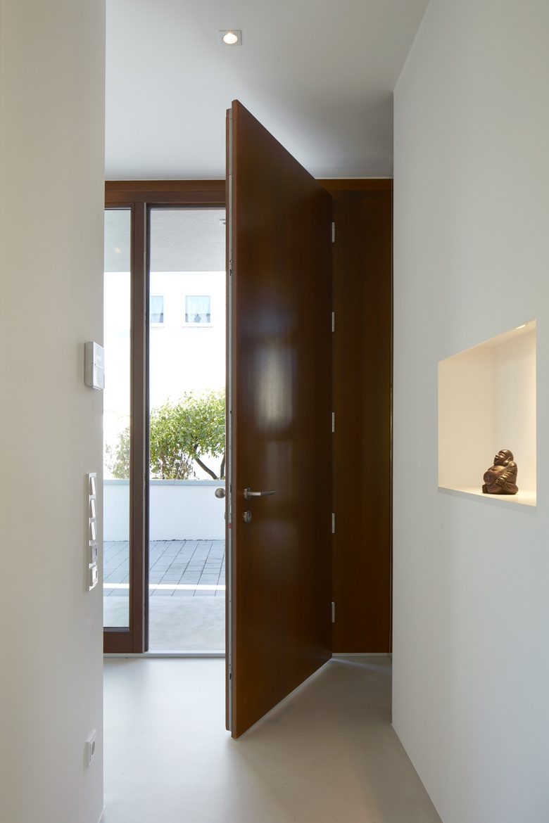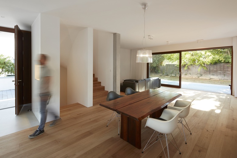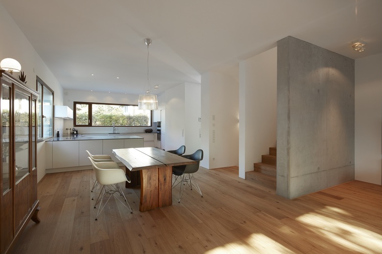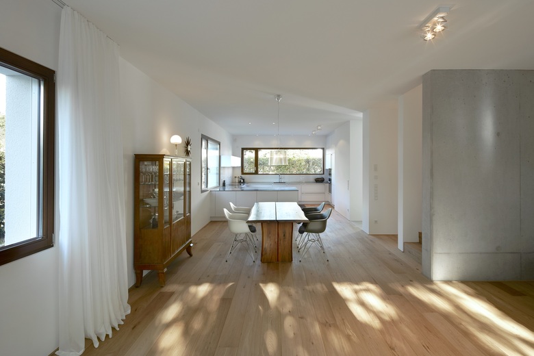 Die voluminösen Ein- und Ausbuchtungen eines zweigeschossigen Kubus gestalten den Hauseingang, die Loggia und den Freisitz. Ein offenes Erdgeschoss in Form eines Einraumes und ein klassisches Obergeschoß mit Schlaf- und Badezimmern plus kleinem Büro bieten Raum für eine vierköpfige Familie. Das Haus wird monolithisch und mit regenerativer Haustechnik erstellt.