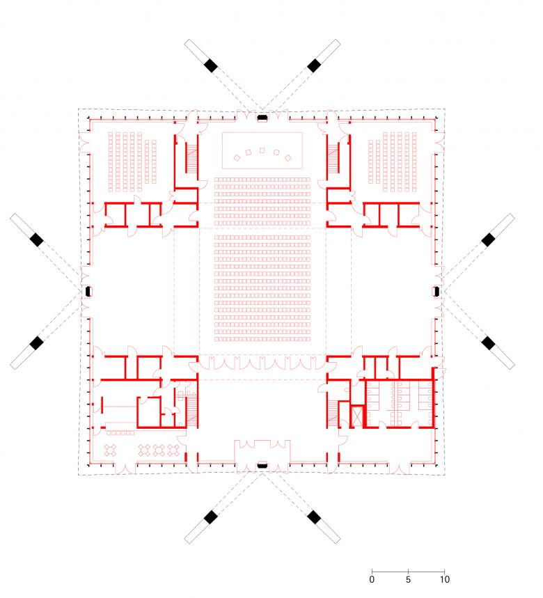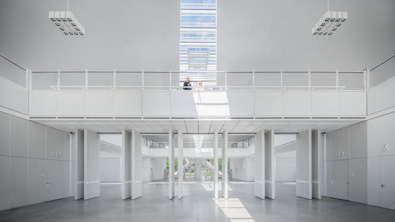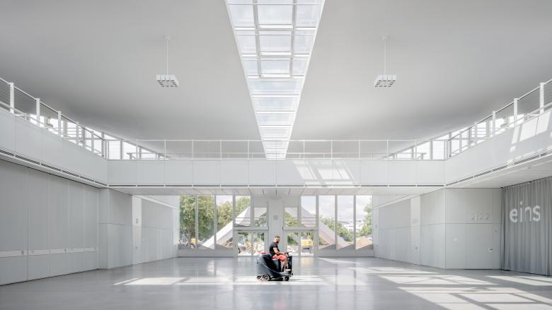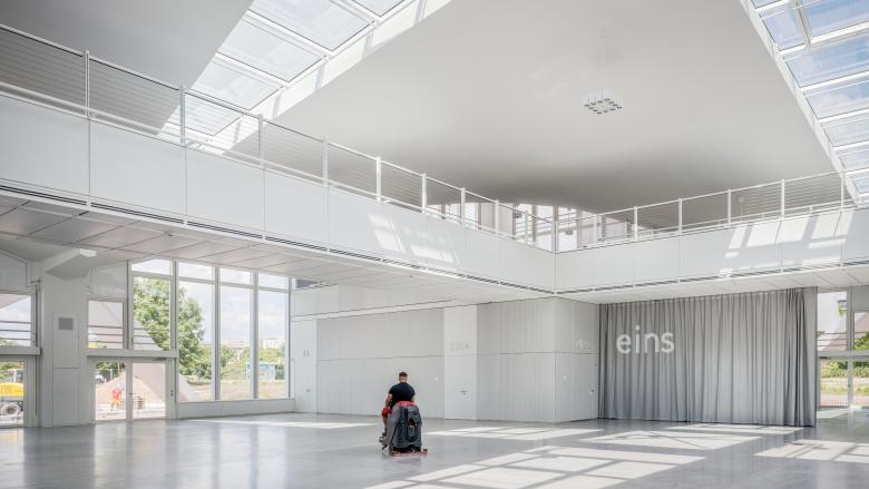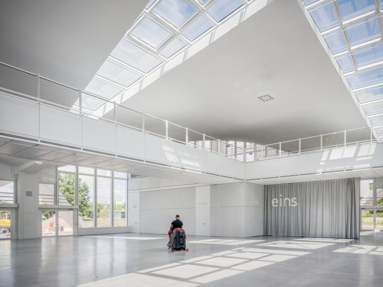 Eine neue Raumstruktur im Innenraum greift Müthers quadratisches Grundsystem auf und macht den offenen Raum mit seinem geschwungenen Dach vielfältig erlebbar: Zur Umsetzung des von der des von der Landeshauptstadt Magdeburg in Auftrag gegebenen kleinteiligen Raumprogramms wurden vier Kuben mit Grundflächen von 15 x 15 Metern jeweils in den Ecken der Halle angeordnet. Auf den Kuben entstehen Galerien, die durch Brücken miteinander verbunden sind. Die flexibel nutzbare Struktur erzeugt zusammenschaltbare Räume für kleinere Veranstaltungen, Seminare, Ausstellungen und Gastronomie, die den großen Veranstaltungssaal für bis zu 500 Personen in der Mitte der Halle räumlich fassen.