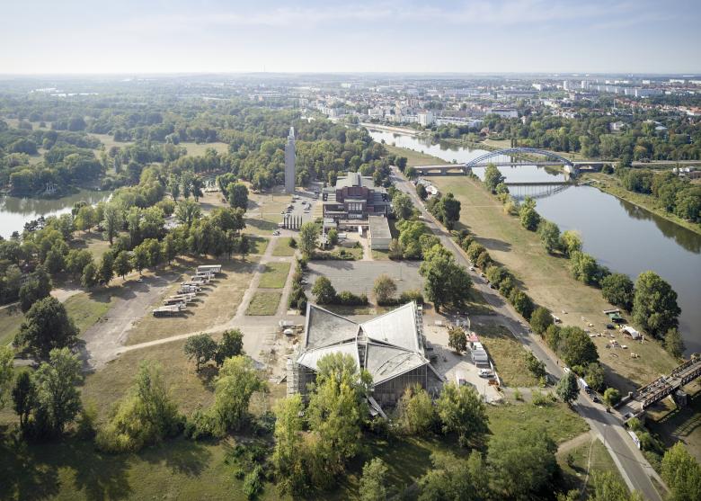 Die Hyparschale am östlichen Elbufer konstruierte der Bauingenieur Ulrich Müther (1934–2007) aus vier hyperbolischen Paraboloiden. Die regelmäßig doppelt gekrümmten Dachflächen überspannen zusammen eine Fläche von 48 x 48 Metern und ermöglichen eine komplett stützenfreie Halle. Damit ist die 1969 für die Magdeburger Messe als Mehrzweckhalle erbaute Hyparschale eines der größten erhaltenen Bauwerke dieser Art.