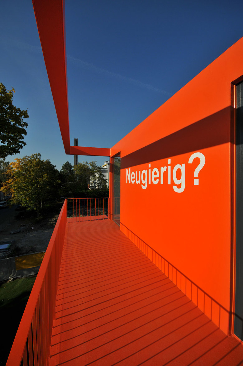 Temporäre Informationsbox für ein Neubaugebiet der Wiesbadener Wohnungsbaugesellschaft GWW. Eine einfache und preiswerte Konstruktion sowie die Möglichkeit, die Infobox auch nach Fertigstellung noch zu versetzen (erfolgte in 2008) waren die ökonomischen und technischen Anforderungen. Gestalterisch durfte es etwas mehr sein.