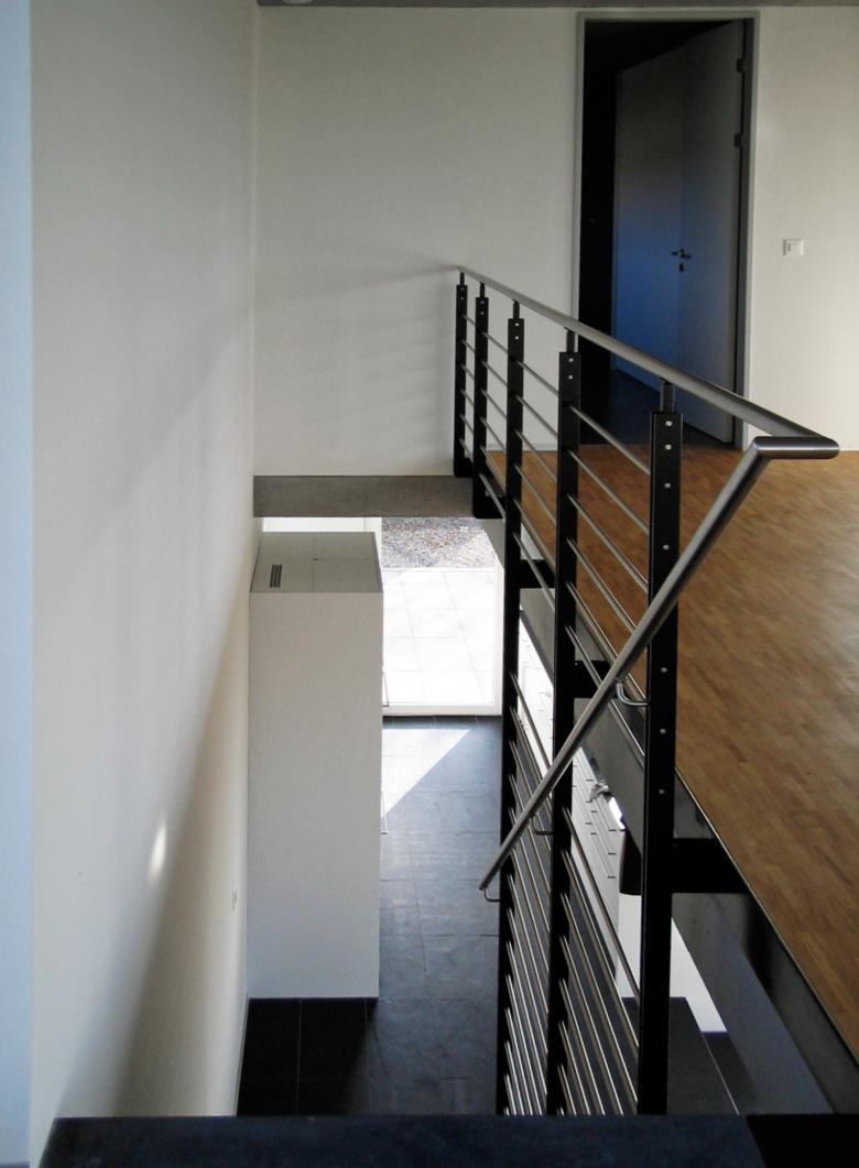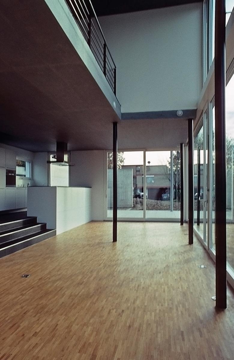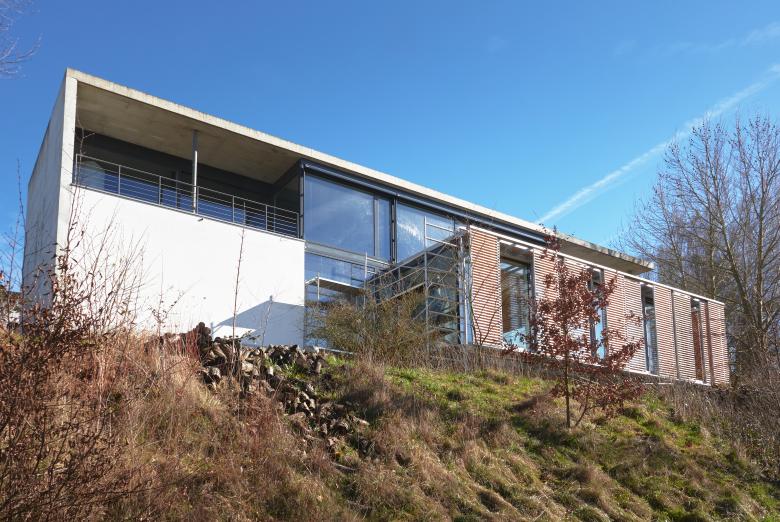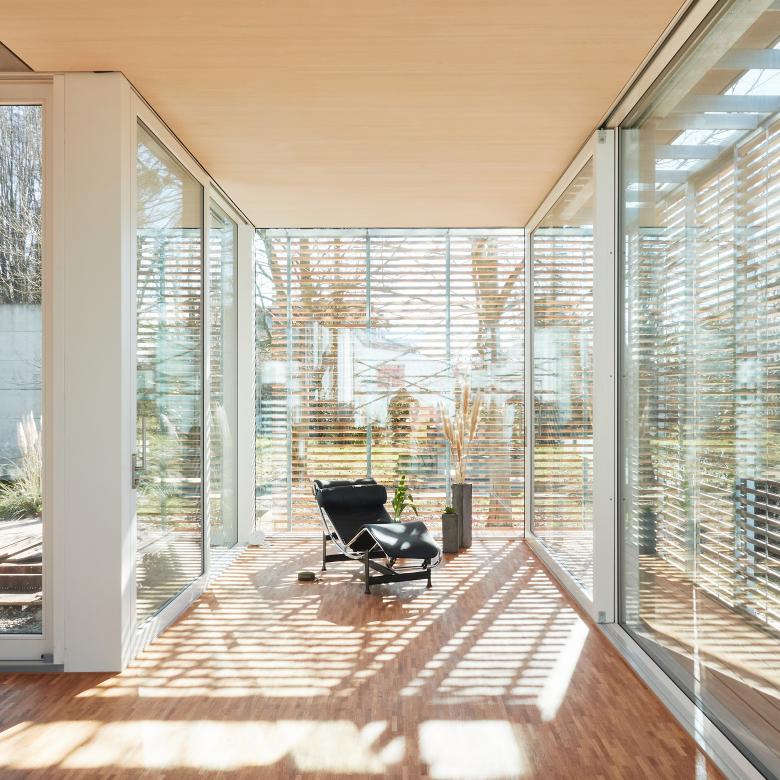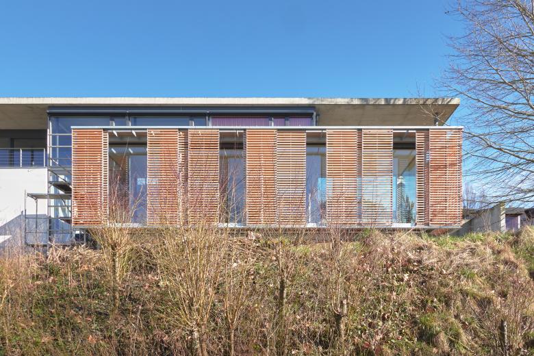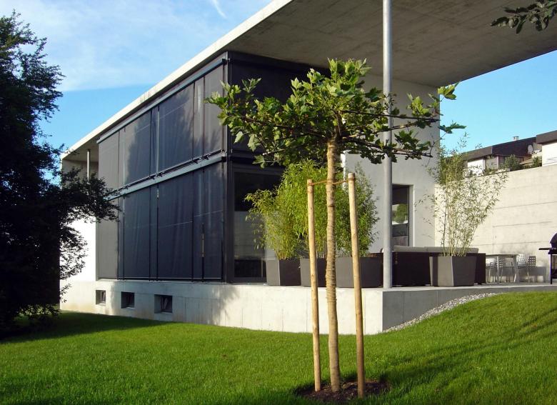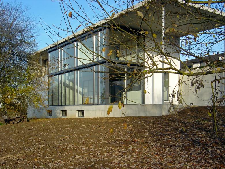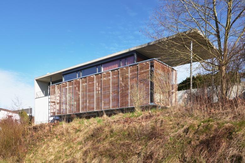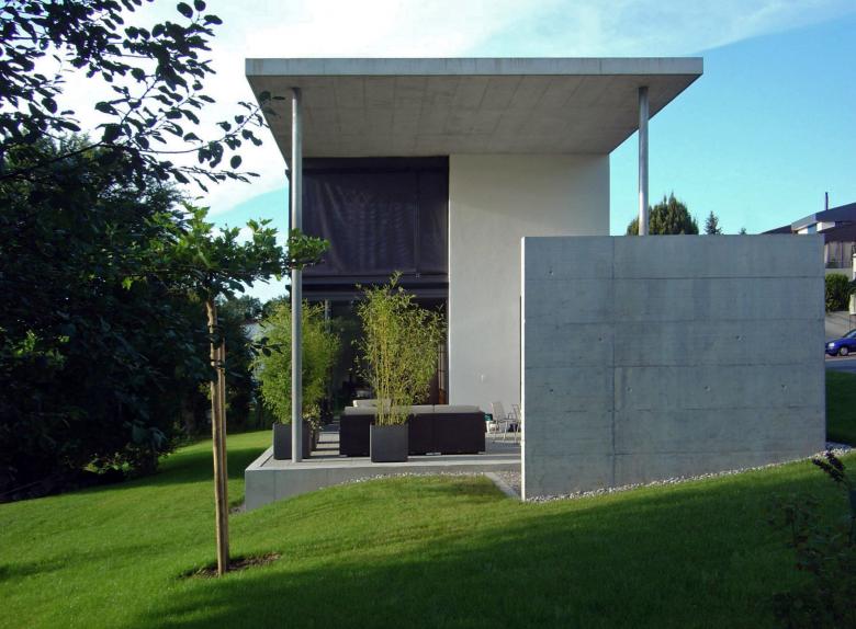Das Haus liegt an bester Lage parallel zum Hang. Das Dach ist ausladend über den seitlichen Sitzplatz gezogen und schafft mit dessen Umwandung einen schönen Aussenraum. Auch innen ist dar Raum über eine Galerie bis unter das Dach erlebbar. 13 Jahre später wurde eine Ess- und Wohnraumvergrösserung gewünscht. Ein vorgelagerter, transparenter Baukörper konnte durch dessen versetzte Anordnung den seitlichen Aussenhof geborgener wirken lassen. Auf der anderen Seite blieb dadurch die Talsicht unverbaut.  Die Schiebewände, welche mit Holzlamellen eingekleidet sind, erzeugen nicht nur ein schönes Lichtspiel, sondern auch die Talsicht bleibt so auch bei starker Sonneneinstrahlung jederzeit frei.