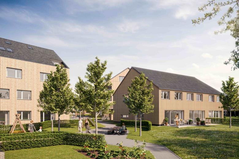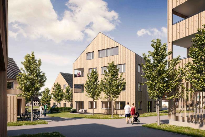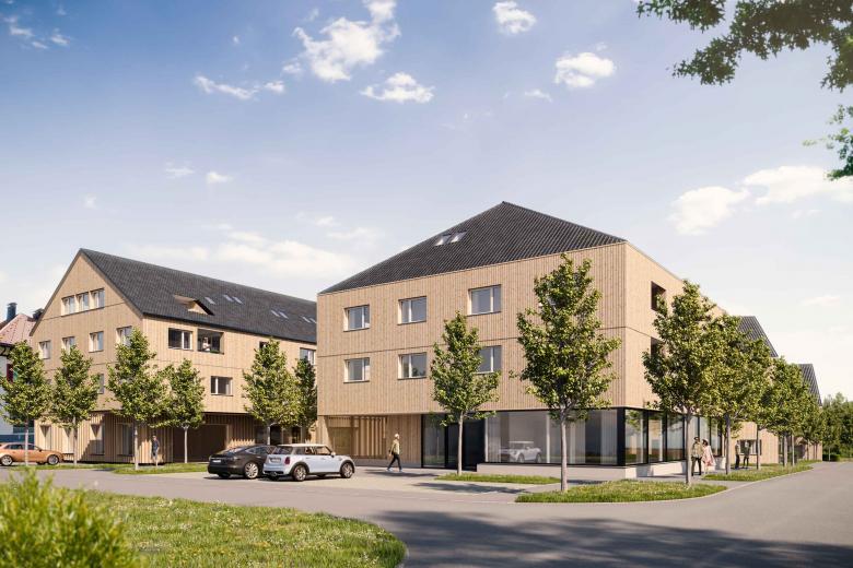 Im Ortszentrum von Hohenweiler entsteht eine hochwertige Wohnanlage mit fünf Gebäuden. Eine Holz- Beton- Hybridbauweise mit Holzfassade setzt nachhaltige Impulse im Dorfzentrum.