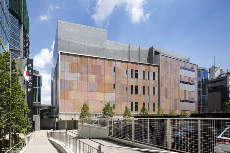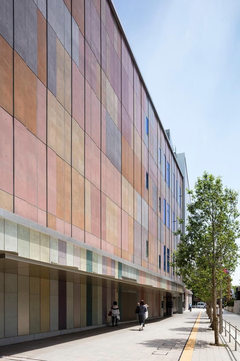 南西ファサードはフレームにより分節し、フレーム内にはコンクリートの素地を生かしたカラーパネルによる渋谷の街を象徴するアートウォールをデザインした。