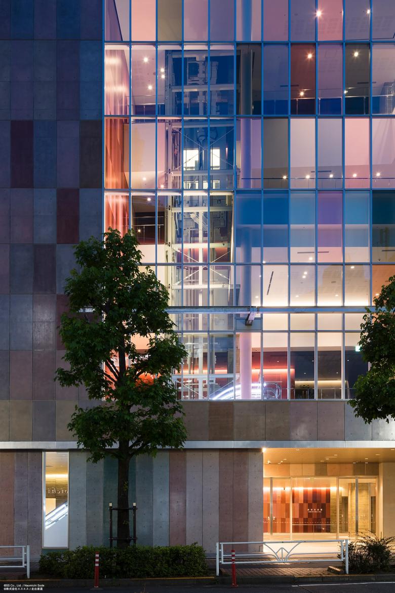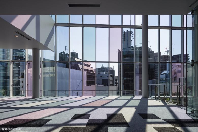 渋谷公会堂建て替え計画。人々が集い非日常の祝祭が展開する公会堂は、その高揚感を表すべく「祭」をテーマに抽出した華やかな色味を組み合わせたカラーガラスを通して、ホワイエ内の賑わいが公園通りの賑わいと一体になるようにデザイン。