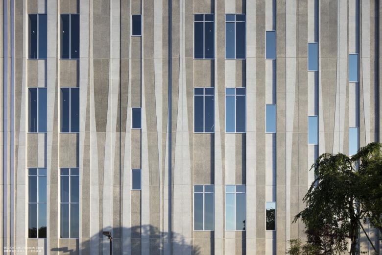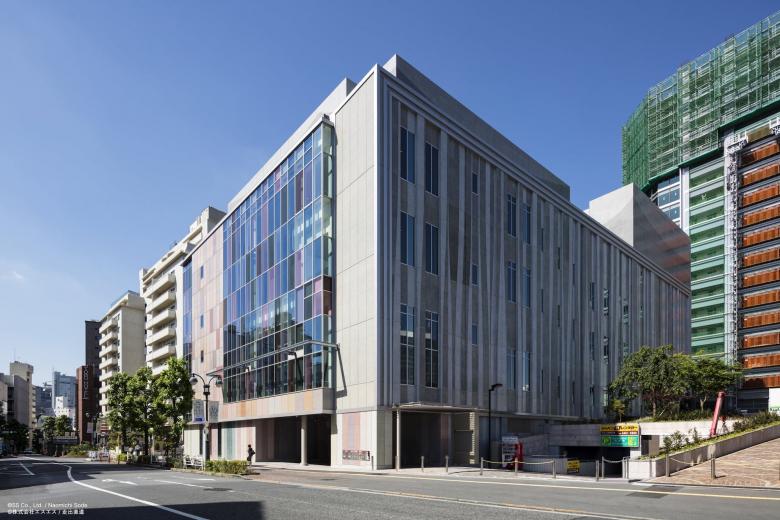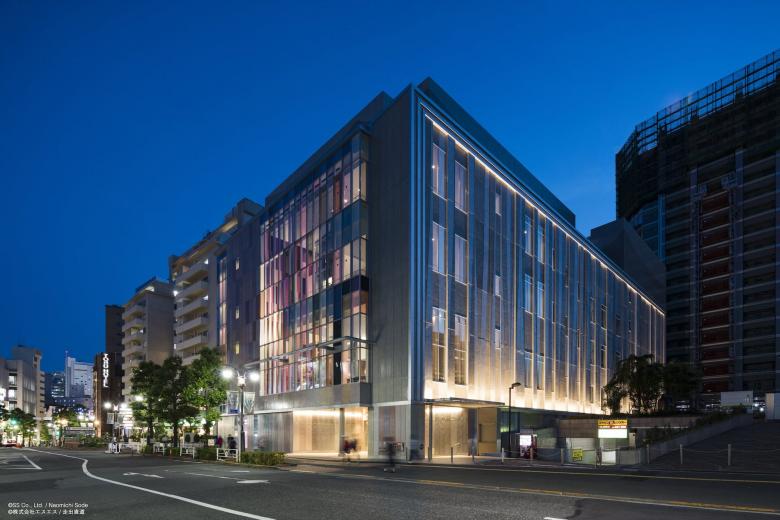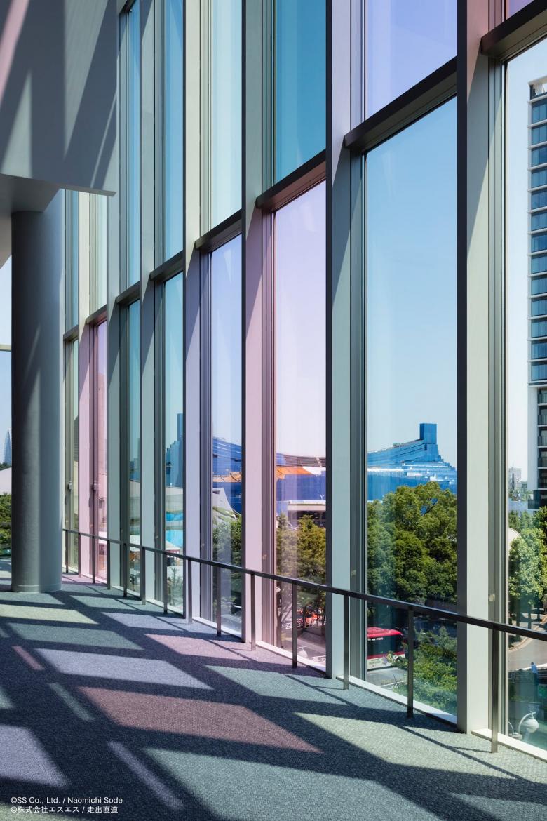 また、代々木公園側の外装はステージを囲うフォーマルなフレームと、舞台幕をモチーフにこれから広がる物語の始まりを予期させるようなドレープカーテンの柔らかさが人を迎え入れ、劇場としての存在感を示している。