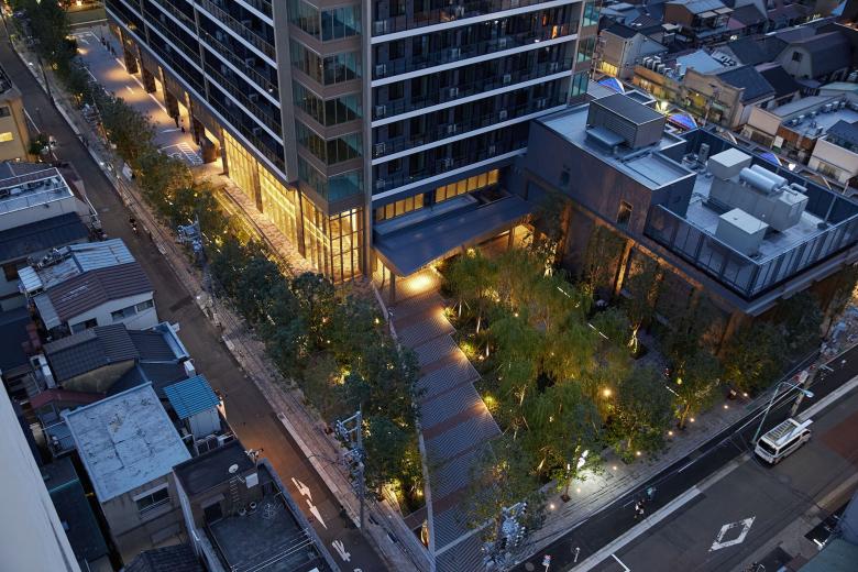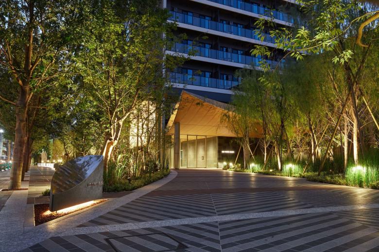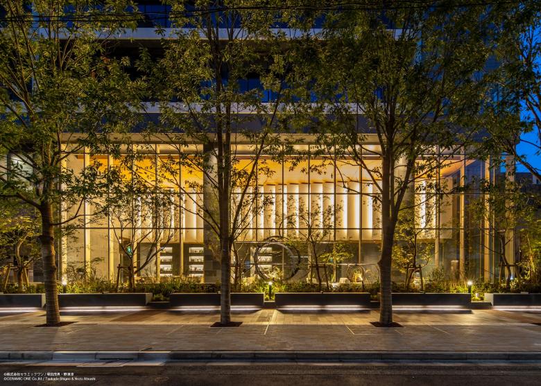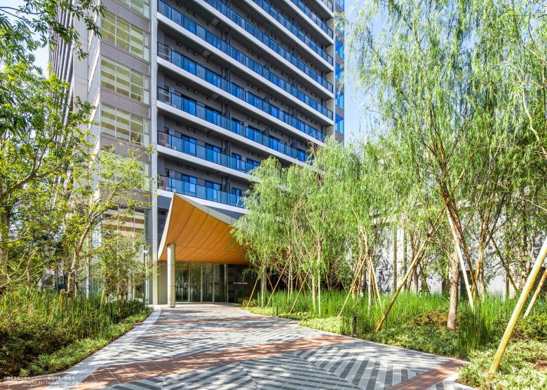 ランドスケープデザインは建物全体に用いられている「月」のモチーフに合わせ、敷地の角から大きな「アーチ」を描いた舗装がエントランスへと人を導いている。 「アーチ」に沿って設けられた植栽エリアと水景は都心の喧騒と隣り合わせの日常のなかで憩いの場としても利用されるよう、オープンに計画されている。 エントランスラウンジから望むステップ状の水景は、水面が柔らかく光を反射することで内部と外部の境界を和らげるような効果をもたらしている。 植栽は、月島の下町情緒あふれる街並みを魅力的に演出するため、シダレザクラ、シダレヤナギ、トクサといった和の景観に合う植物を選定している。