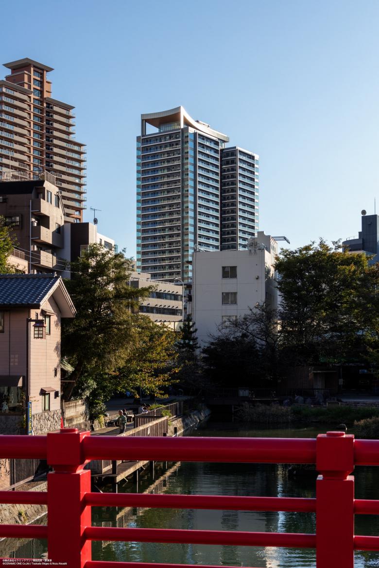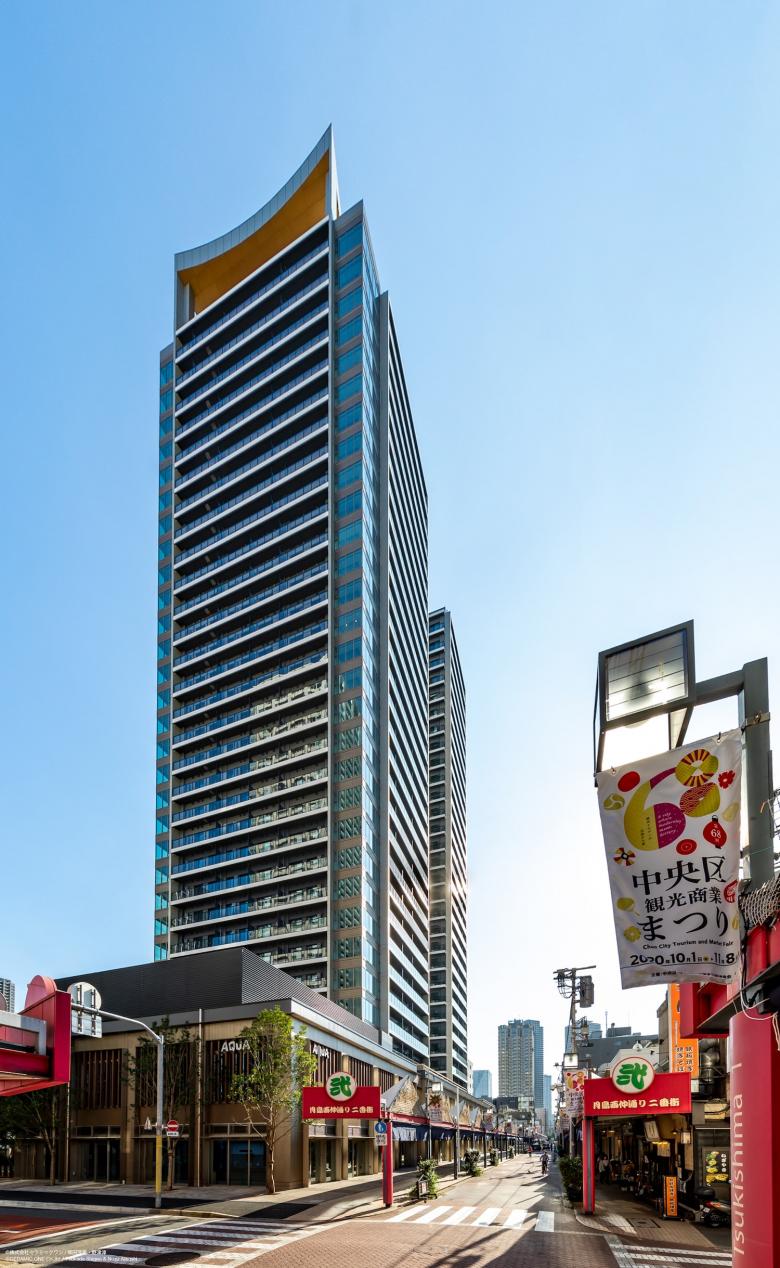 銀座や日本橋に歩いて行ける都心にありながら、下町情緒あふれる街並みが残る月島に計画された超高層集合住宅プロジェクト。 地名から「月の島」という連想をベースに、月の光と影が生み出す幻想的な世界観をコンセプトに外観と共用空間のデザインに取り組んだ。 建物頂部の見え方を強く意識して、最上階・ペントハウスのルーフには空に浮かぶ月のような曲線美の「アーチ」をデザインし、遠くから見ても印象に残るアイコニックなタワーとしている。 「アーチ」はグランドエントランスの庇にも呼応するように描かれ、緑豊かな植栽とともに建物全体の佇まいに優雅さを添えている。