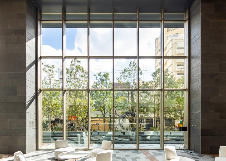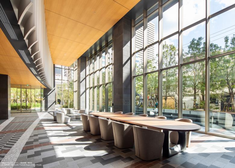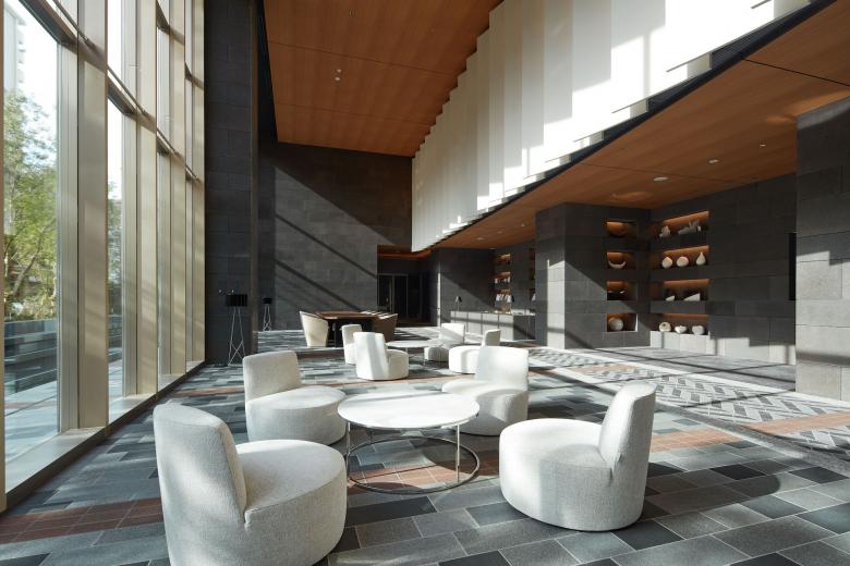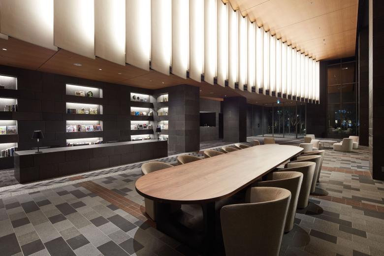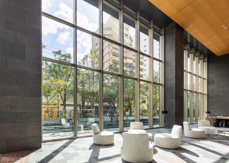 1階のエントランスラウンジエリアは2層吹き抜けでガラスファサードに面した開放感のあるスペース。 都心の喧騒と隣り合わせの日常だからこそ、外部と内部がしなやかに切り替わる場所としてデザインしている。 外部ランドスケープの舗装が描く「アーチ」はエントランス内部壁面にそのまま繋がり、壁面に連続する白いパネルでも角度を変えながら、スペース全体で1つの大きな「アーチ」をつくりあげている。大きく描かれたその「アーチ」は本プロジェクト全体のモチーフである「月」を思わせるデザイン。 エントランスラウンジはライブラリーとして使えるスペースでもある。 「月」のようにごつごつした石材をくり抜いたシェルフがエントランススペースの一部にオープンにつくられているため、開かれた気軽に使えるライブラリーとなっている。