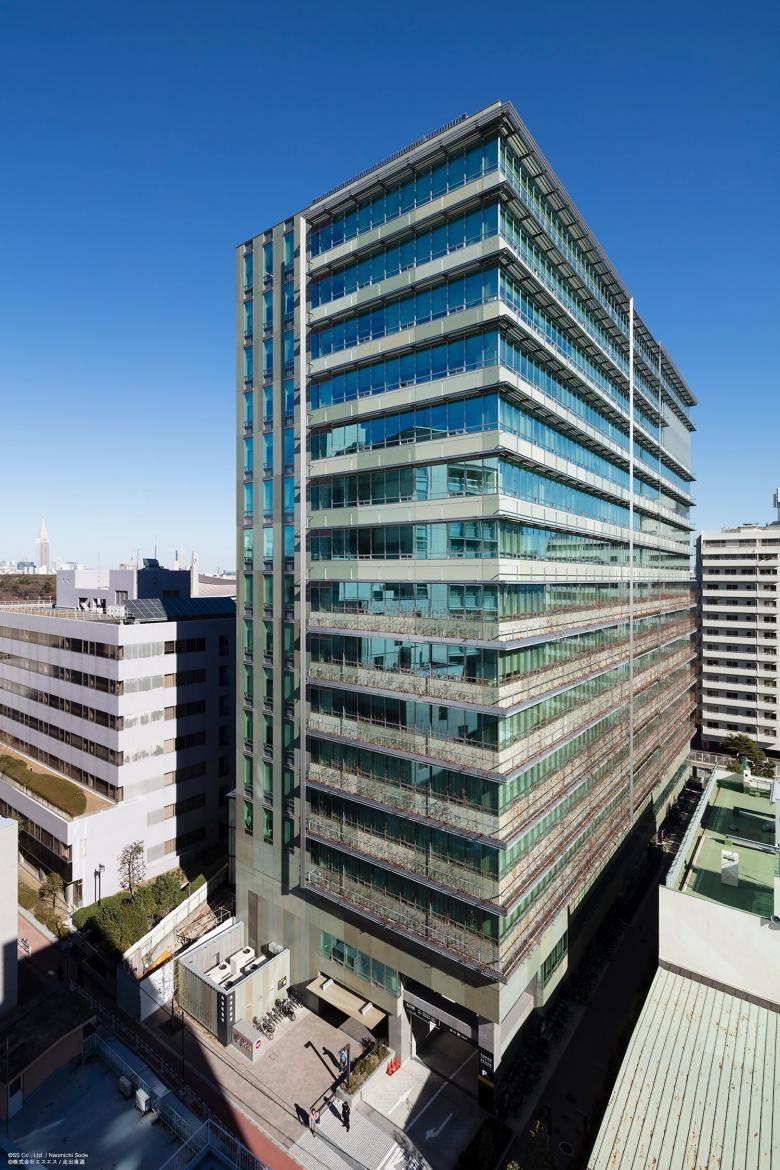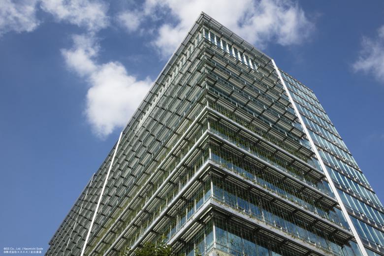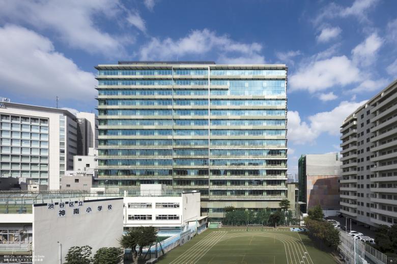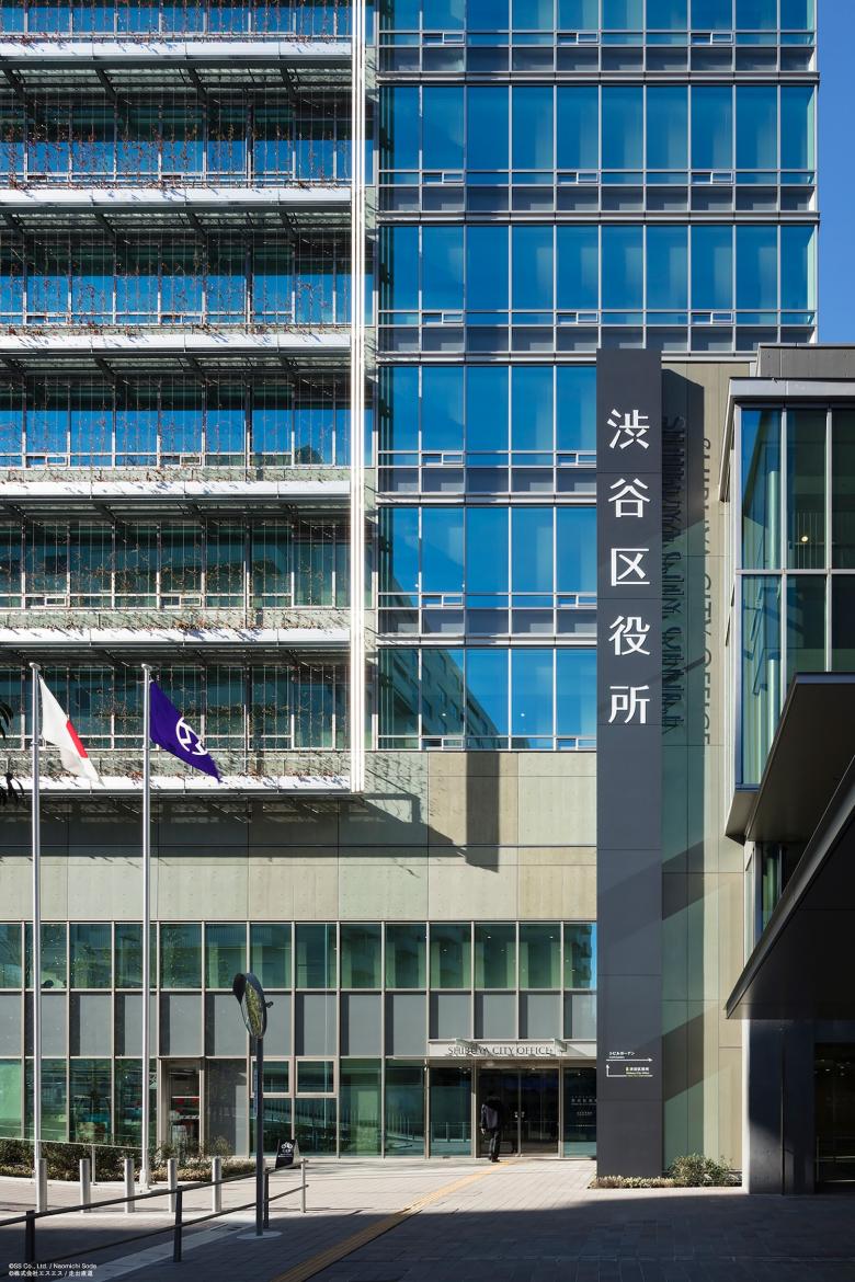 外壁はそれらのカラーを用い、緑を中心としながら落ち着いたカラーグラデーションパネルと壁面緑化を一体にデザイン、壁面全体がアートウォールとなり、庁舎の建築的ボリュームが渋谷の街に柔らかい形で融和することを目指した。