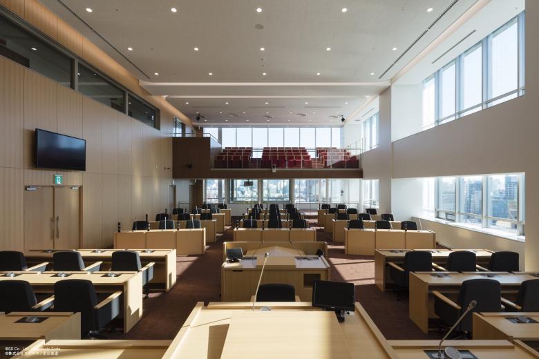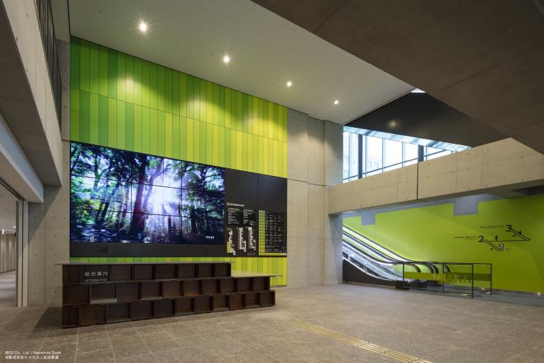 エントランスホール内部のグリーンカラーウォールを中心に、インテリア各所にグリーンのカラーグラデーションを用い、屋内外で「緑」を感じさせる一体的なデザインとすることで、建築の境界を感じさせず、公園のように街へ開かれた渋谷区役所というパブリックな機能にふさわしい公共建築をデザインした。