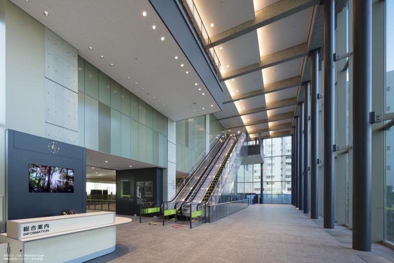 区庁舎では常に人が往来し、繁雑な場所で目的の場所までスムーズに動線を計画することが求められるため、各階層に使用するグリーンの色味をそれぞれ設定して、地上階から最上階にかけて濃色から淡色へ段階的に変化することで、視覚的・感覚的に自分の位置が認識できるようにしている。