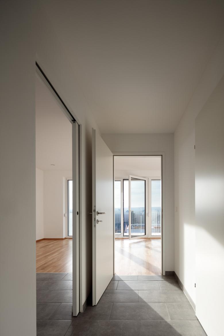 Bei der Entwicklung der Wohnungen wurde auf eine sehr kompakte Größe geachtet. In den Obergeschoßen gibt es 2- bzw. 3-Zimmer-Wohnungen. Jede Wohnung hat einen großen, dem Wohnzimmer vorgelagerten, Balkon Richtung Westen mit einem weiten Blick über den Ort und den Hügeln der Umgebung. Im Erdgeschoß gibt es 2 größere Wohnungen mit Eigengarten.