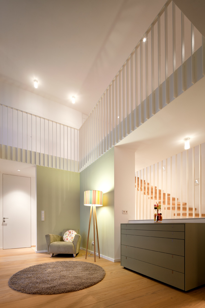 Das Erdgeschoß besteht in erster Linie aus einem großen Raum mit Zonen fürs Kochen, Essen und Wohnen. Dieser gemeinsame Wohnraum steht durch großflächige Verglasungen in enger Verbindung zu den Terassen- und Gartenflächen. Im Erdgeschoß finden sich zusätzlich noch ein Wirtschafts- und ein Büroraum. Im Obergeschoß befinden sich die Rückzugsorte, wie Schlaf- und Badezimmer.