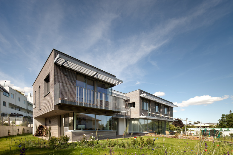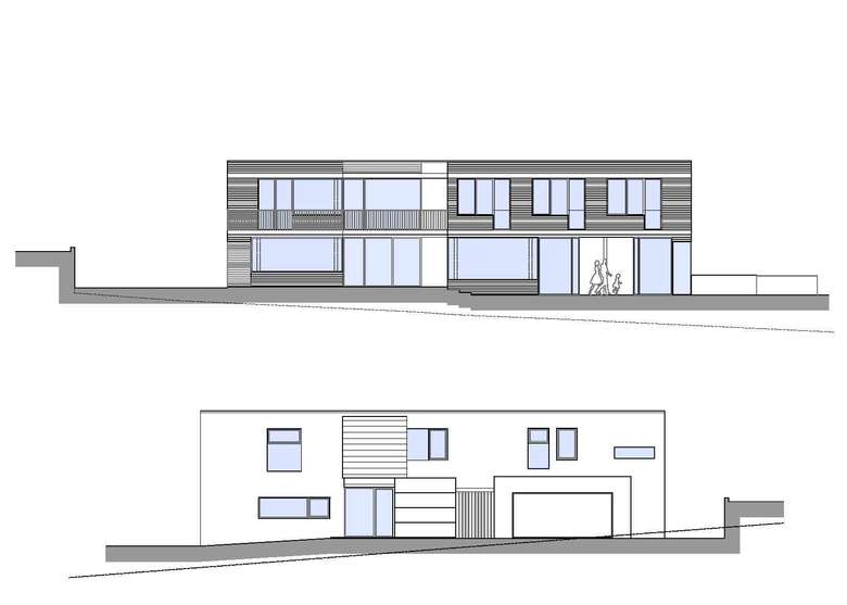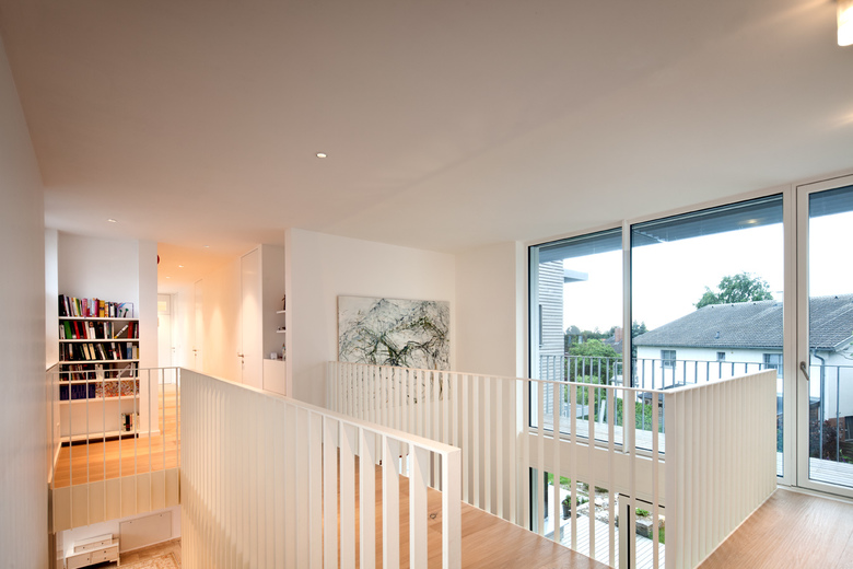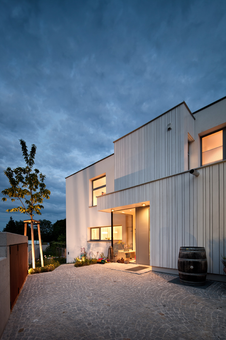 Wunsch der Bauherren war ein Haus für die 5-köpfige Familie in dem der Garten und die Jahreszeiten integriert werden. Daher wurde das Gebäude nicht parallel zur Grundstücksgrenze, sondern nach der Sonne ausgerichtet positioniert. Morgensonne, in der Küche und einigen Schlafräumen, Sonne den ganzen Tag in den Haupträumen und Abendsonne in ausgewählten Bereichen. Auch die im Keller befindlichen Aufenthaltsräume sollten Tageslicht bekommen, daher wurde die Höhenlage so gewählt, dass durch die Geländemodellierung an der Ostseite ein Lichthof entstand.