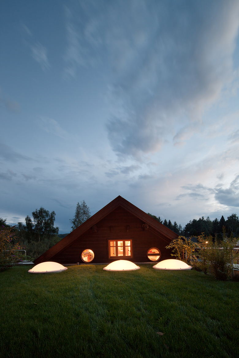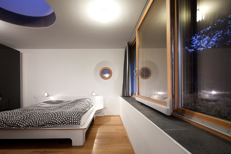 Der Hinterausgang mit der Stiege auf das Gründach bzw. der neu geschaffenen ebenen Gartenfläche liegt an dem Kreuzungspunkt der „familienöffentlichen“ Fläche und der Privatsphäre der Eltern. Die beiden „Kinderzimmer für Erwachsene“ sind in einem großen Raum zusammengefasst, können aber mit einem Vorhang abgetrennt werden. Ganz im Osten schließt das Elternschlafzimmer an. Die Terrasse endet schon vorher um dem Bedürfnis nach Geborgenheit entgegen zu kommen.