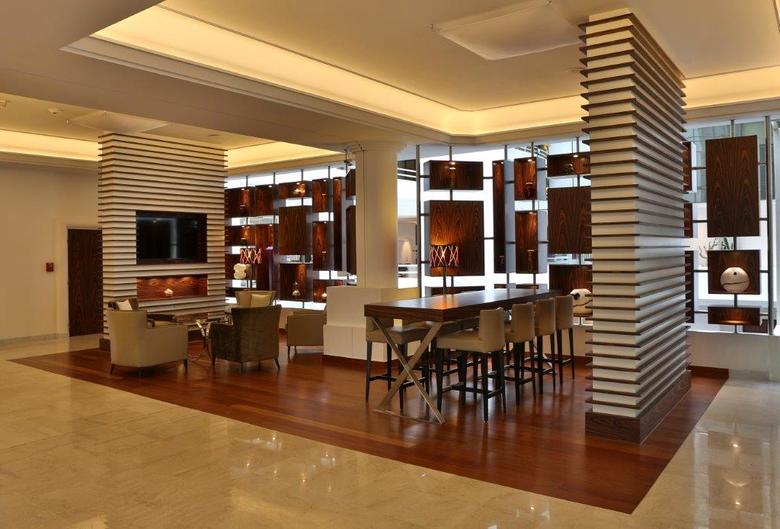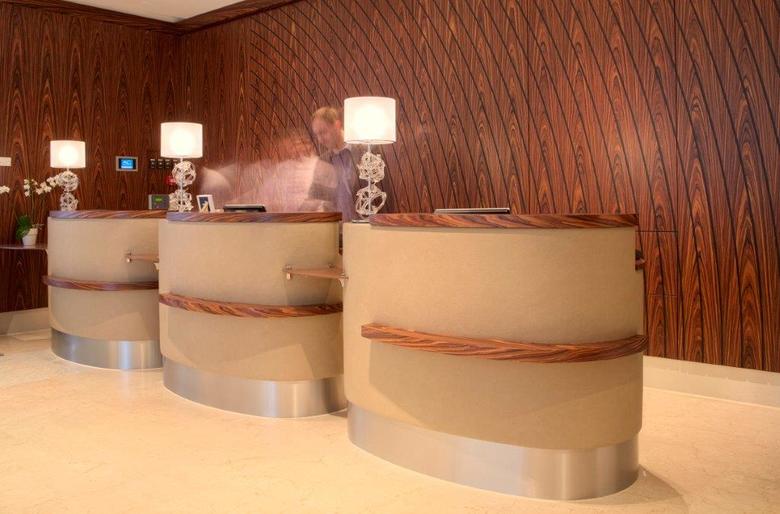 Die ersten Schritte führen Besucher in der feintonig gestalteten Lobby an edle Empfangscorner, die mit hellem Leder verkleidet sind und durch rötlich-braunes Holz akzentuiert werden. An der dahinter liegende Wand wird dieses Teakholz erneut aufgenommen. Als Anlehnung an den maritimen Ort entspricht die Verarbeitung der Wandverkleidung durch den leichten Schwung der wie für einen traditionellen hölzernen Schiffsrumpfs. Auf den Cornern befindliche Tischlampen, deren Glaskörper an verschlungene Schiffstaue erinnern, greifen dieses Thema erneut auf.