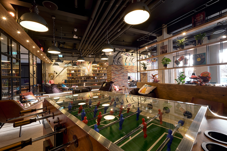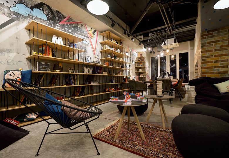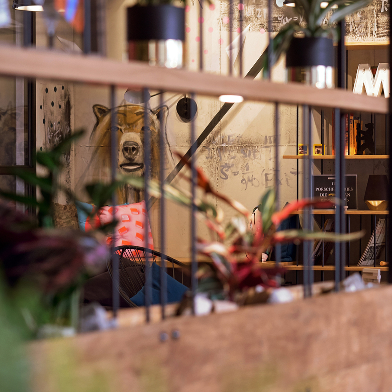 Im Moxy Berlin wird es authentisch, gemütlich und gleichzeitig industriell und hip. Schon beim Betreten der Lobby begibt sich der Gast auf eine Entdeckungstour und trifft hier wieder und wieder auf das Berliner Wappentier, den Bären, der als Maskottchen fest in dem Konzept manifestiert ist. Freigelegte Betonflächen erzählen von der Geschichte des Hauses, und Accessoires und Bücher verraten mehr über Berlins Geschichte und dessen Sehenswürdigkeiten. Die verschiedenen Zonen sind ausgestattet mit einem Mix aus Lounge- und anderen bunt zusammengewürfelten Möbeln, Streetart an den Wänden und vielen poppigen Accessoires. So entsteht eine perfekte Raumbasis für einwandfreies Arbeiten in lockerem Ambiente, ein legeres Businessmeeting oder eine Partie Schach mit dem Kumpel nach einem langen Arbeitstag.