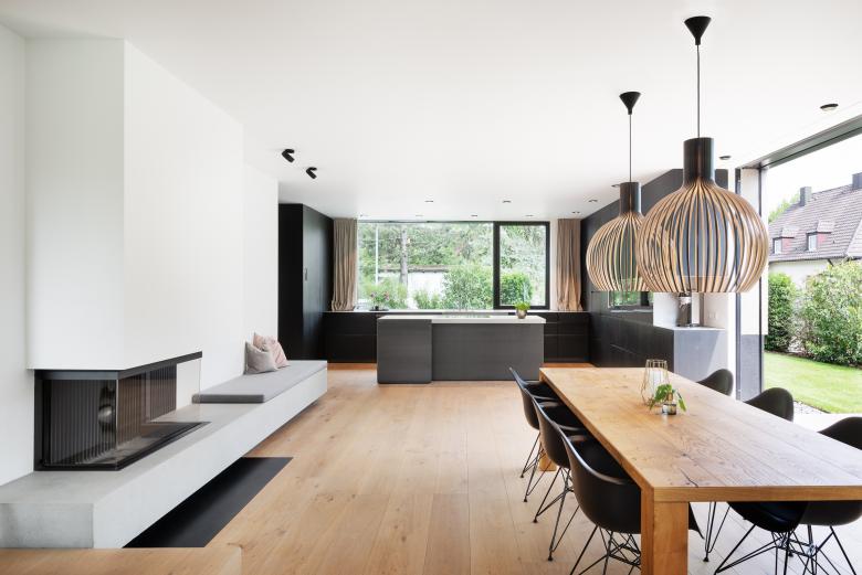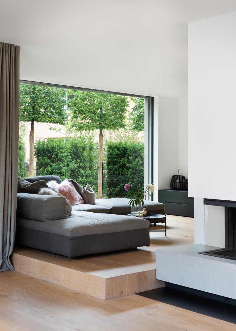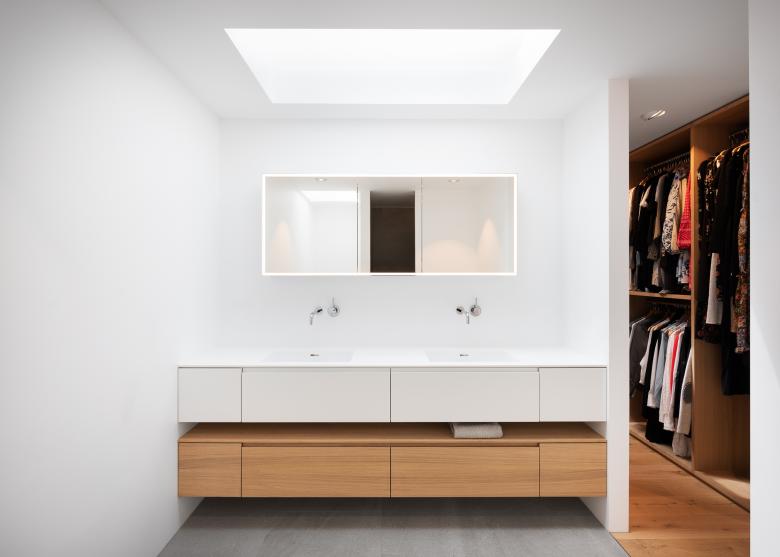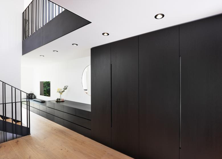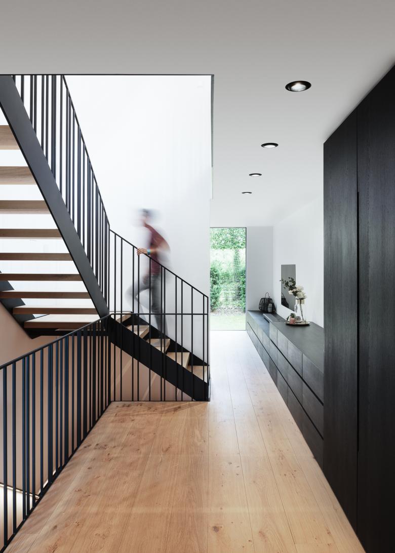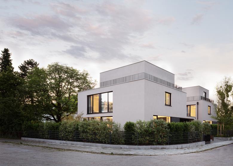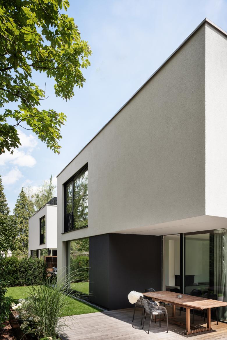 Both of the two houses possess the same conceptual design and built with the same materials, yet are entirely different from one another in terms of spatial arrangement and user experience. Stacked off-white rendered cubes sit on top of a black 'skirting' that envelope the house. Larger windows sit between the two contrasting colours and the smaller windows punch through the upper cubes. The concept makes an appealing and ever-changing appearance to each façade.