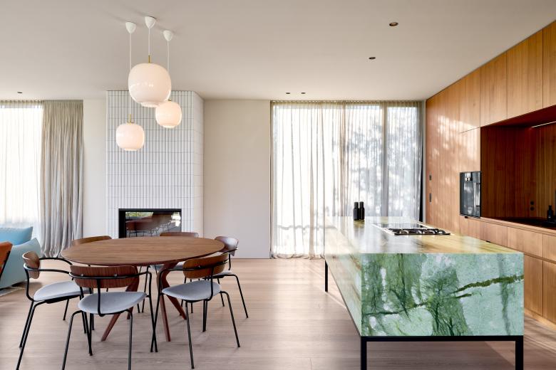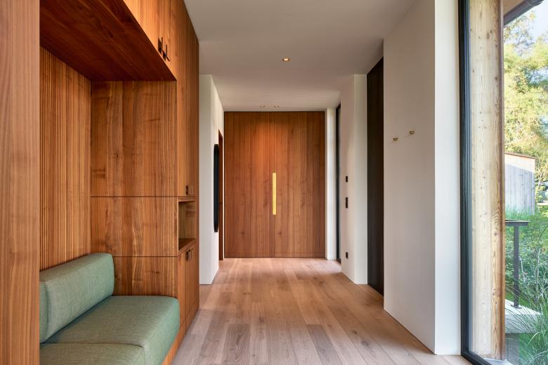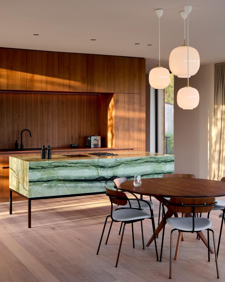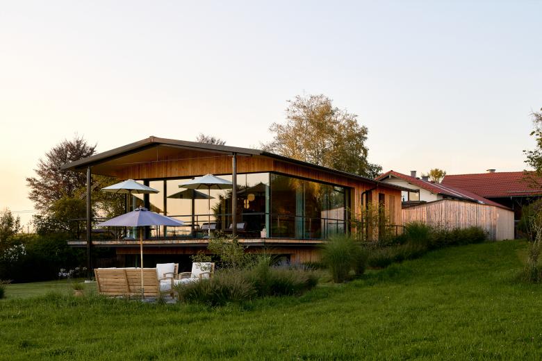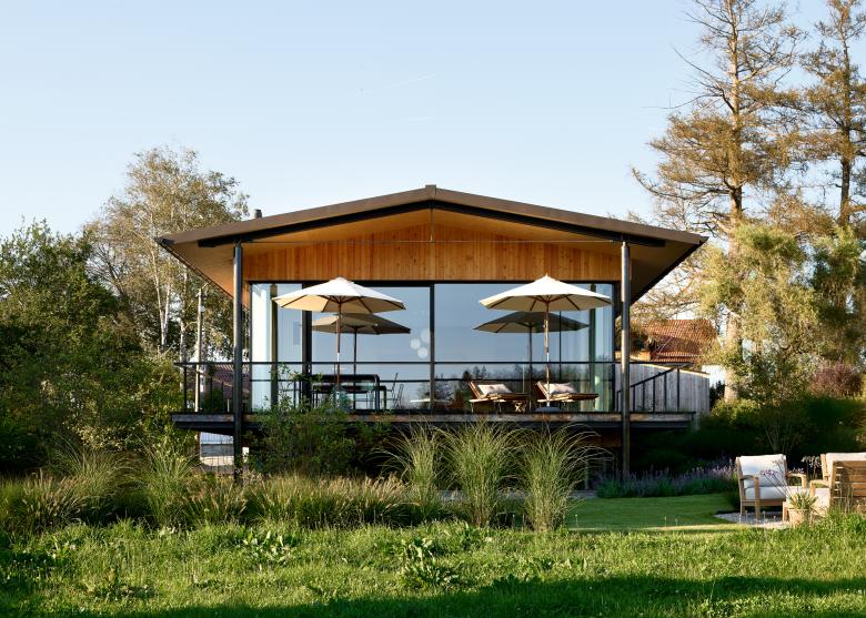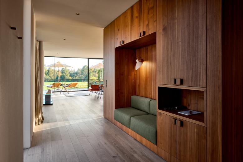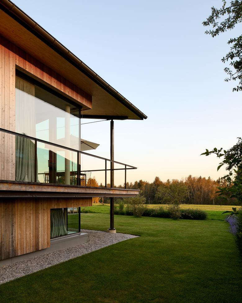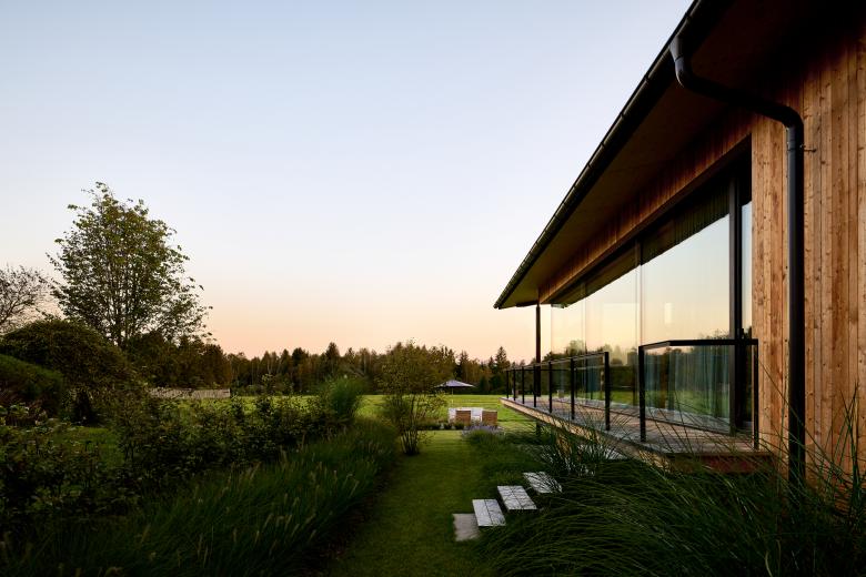 While I was waiting for the golden hour to commence, I watched the cows peacefully passing by at the bottom of the garden. The interior is rich in texture and natural materiality. Soon I was presented with a scene soaked in warm golden sunlight as it penetrated the interior. The timber-clad house has the appearance of gently resting on the ground, which was emphasised by choosing to photograph late summer when the grass is long enough to communicate the concept of floating.