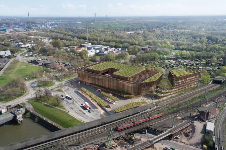 Der neue „Zusammenhub“ soll zum kommunikativen Zentrum der Elbinseln werden. Das Bauwerk zeichnet sich im Wesentlichen durch eine Zweiteilung aus, die durch ein begrüntes Verbindungselement zu einem Gebäudeensemble gefasst wird: der Busbetriebshof und ein leicht zurückgesetztes, dreieckiges Gewerbeobjekt. Über die fließende und organische Architektur fügt sich das kompakte Ensemble selbstverständlich in den städtebaulichen Kontext ein. Die Rückstaffelung der Geschosse zwischen den beiden Nutzungseinheiten bewirken eine einladende Geste in Richtung S-Bahnhof. Terrassierte Freibereiche bieten ein Blick zum Hafen und zur Kernstadt. Auch die Verwaltung des Busbetriebshofes ist zum grünen Binnenraum hin orientiert.