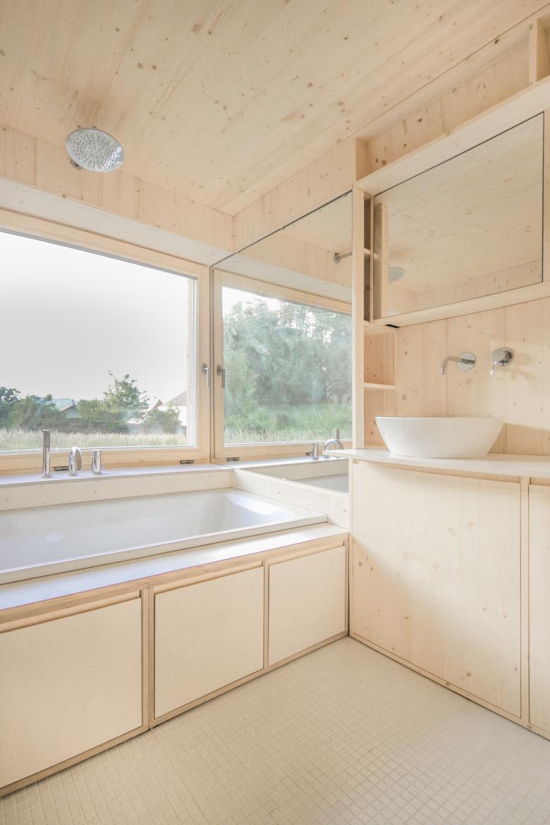 Das Projekt verfolgt ein ganzheitlich nachhaltiges Konzept in Planung, Nutzung und Umsetzung. Das Haus ist aufgeständert und berührt das Gelände nur über die acht Schraubfundamente. Dadurch wird keine Bodenfläche versiegelt. Die verwendeten Materialien stammen Großteils aus der unmittelbaren Umgebung. Das Holz, sowohl für die konstruktiven Elemente als auch für die Oberflächen stammt aus den bauherreneigenen Wäldern und wurde im benachbarten Sägewerk verarbeitet. Das Gebäude ist mit Stroh gedämmt, das ebenfalls aus der direkten Umgebung, von einem regionalen Bauernhof stammt. Die Wärme und Energiegewinnung erfolgt über die Photovoltaikanlage auf der Dachfläche.