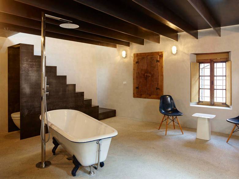 Im ersten Stock lädt ein grosszügiges Badezimmer mit einem Boden aus geschliffenem Beton zum Verweilen ein. Die Badewanne und das Waschbecken sind Retrouvalien, welche restauriert und freistehend im Raum platziert wurden.
