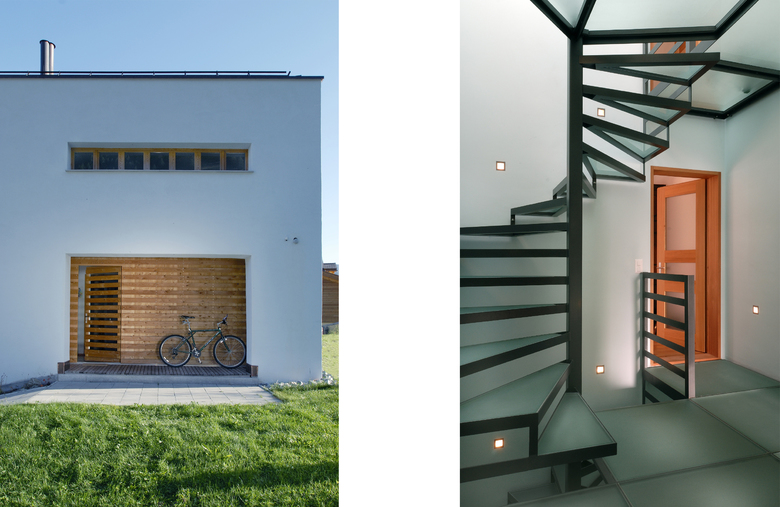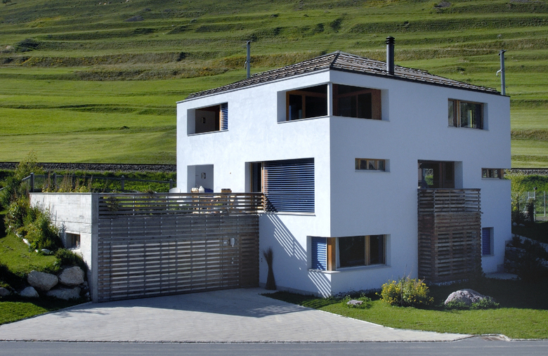 Neubau mit alten Engadiner Bauernhäusern als Vorbild. Wie bei den alten Häusern in der nahen Umgebung, besitzt das Haus ein Walmdach sowie einen quadratischen Grundriss. Die Spitze des Daches ist aus Glas und so wird das Treppenhaus bis ins Kellergeschoss tagsüber mit natürlichem Licht durchflutet. Alle Räume sind um das Treppenhaus angeordnet.