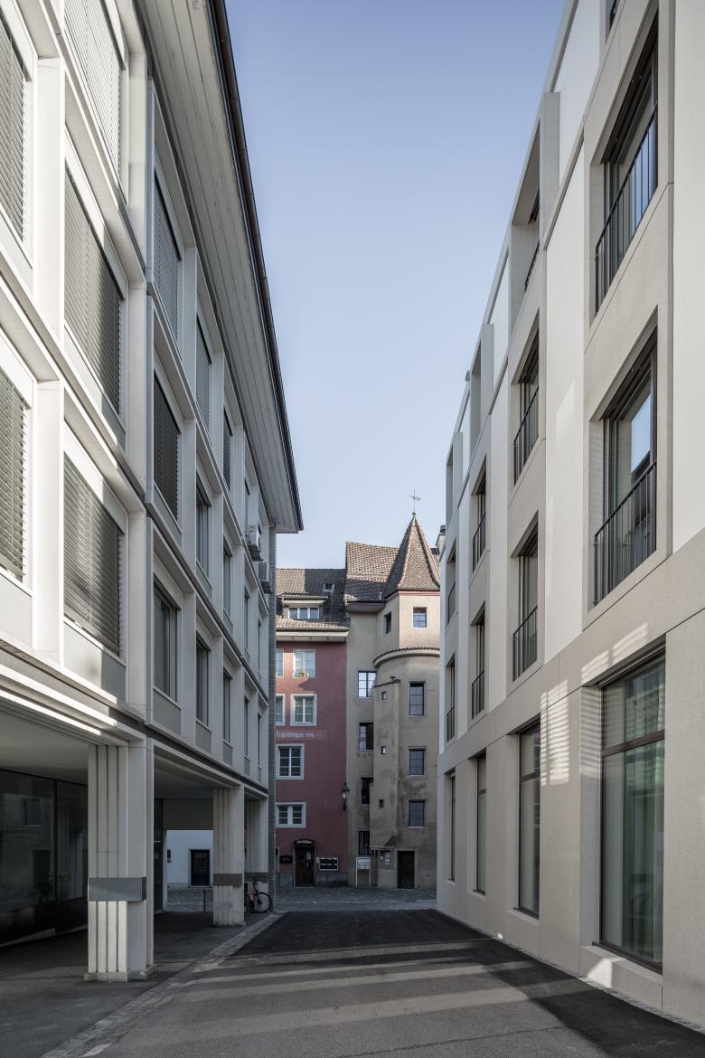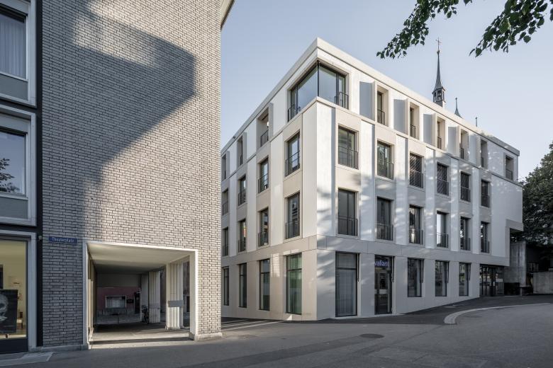 Das Haus definiert sich aus einem Sockel in Stein, welcher der nötigen Widerstandsfähigkeit im städtischen Umfeld gerecht wird und die Schaufenster beinhaltet, zwei Obergeschossen und einem ruhig ausformulierten Attikageschoss. Der feine Rücksprung beim Dachrand zum Attikageschoss hin vervollständigt die angestrebte Fassadengliederung und vermittelt im Gassenraum zwischen den benachbarten Bauwerken.