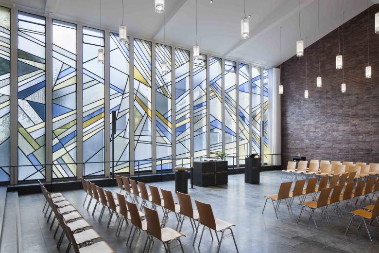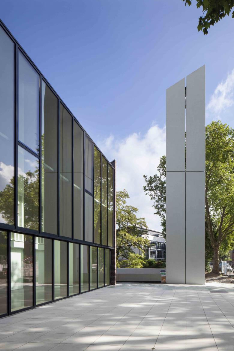 Eine sechs Meter hohe, vollflächige Glasfassade öffnet das Gebäude zum Stadtraum: Kirchenraum, Café und Vorplatz fließen schwellenlos ineinander.