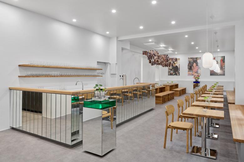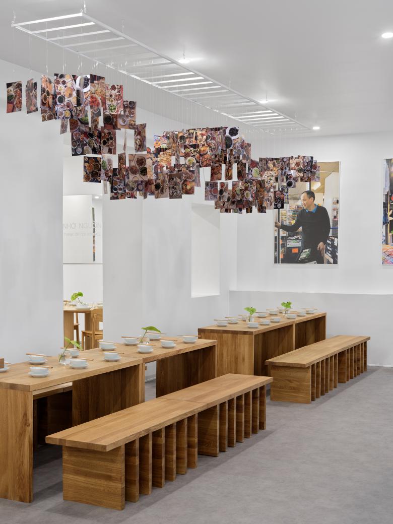 Mit einem klaren und minimalistischen Ansatz verzichtet das Restaurant NHÀN bewusst auf vietnamesische folkloristische Elemente. Stattdessen werden eigens kreierte Installationen in einem neuen und spielerischen Kontext eingesetzt. So werden alltagstypische vietnamesische Haushaltsgegenstände umfunktioniert und als dekorative Elemente auf Vitrinen hervorgehoben. Die wellenförmige Deckeninstallation als Komposition aus diversen Fotografien von traditionellen vietnamesischen Gerichten ermöglicht einen Einblick in die vietnamesische Esskultur. Als Sharing-Konzept werden die authentisch zubereiteten Speisen als Tapas in schlichten Schalen serviert.
