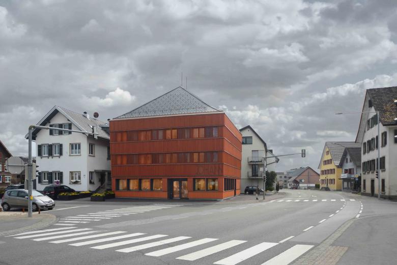 In markanter Lage, direkt an der Kreuzung mit Eingang zum Platz, stand der Gasthof Engel. Von der Mitte des 19. Jahrhunderts an bis heute war hier ein Gastronomiebetrieb, teilweise auch kombiniert mit Einzelhandel. Entsprechend hoch ist auch die Verankerung dieses Treffpunktes im Bewusstsein der Bevölkerung. Vor diesem Hintergrund wollten wir ein Haus planen, das so oder so ähnlich auch früher an dem Ort hätte stehen können. Ein Haus mit Holzfassaden und Walmdach, das sich in der Volumetrie und Materialsprache auf historische Bauten im Zentrum bezieht.