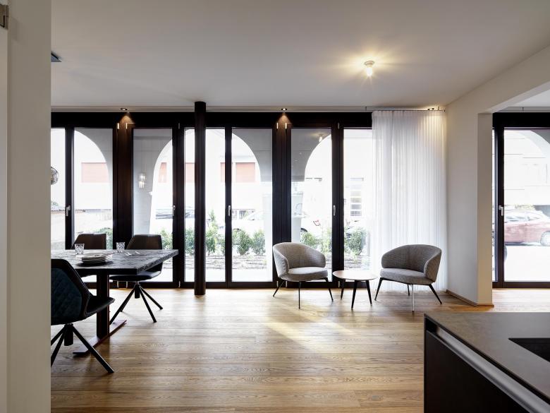 an zentraler und doch ruhiger Wohnlage ein Mehrfamilienhaus mit fünf hochwertigen Eigentumswohnungen. Das Mehrfamilienhaus fügt sich mit seiner modernen Formsprache und durch die Verwendung natürlicher Baustoffe harmonisch in das Strassenbild ein.
