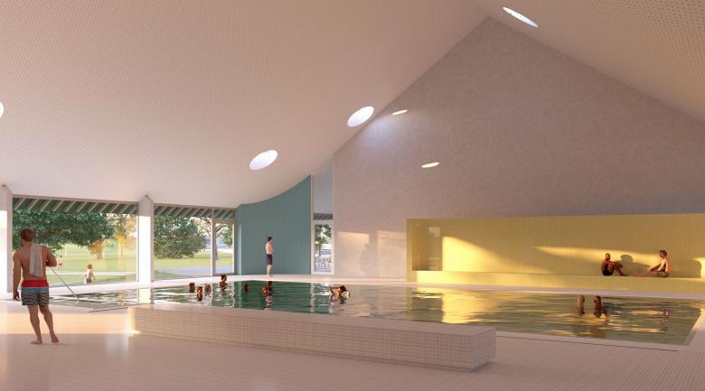 Um den langen Baukörper in seiner Erscheinung und Wirkung in die städtebauliche Situation der Siedlungsstruktur und den Naturraum des Freibades einzugliedern, erhält der Neubau ein Satteldach in Längsrichtung. So wird die vorherrschende Dachform des umgebenden Siedlungsgebiets und der angrenzenden oberen Mühle aufgegriffen und die zu Freibad und Strassenraum orientierten Längsfassaden werden in ihrer Höhe reduziert. Das neue Haus kann als eine Art Badehaus gelesen werden, das sowohl der Hallenbadnutzung einen eigenständigen Auftritt und eine besondere Atmosphäre ermöglicht - zugleich sich aber auch als dem Freibad und dem Naturraum zugehöriges Gebäude versteht.