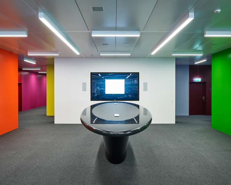 Für diese grosse Bürofläche haben wir ein integriertes lineares Beleuchtungssystem entwickelt. Dieses System ermöglicht eine optimale Ausleuchtung der Arbeitsbereiche. Gleichzeitig reagiert es flexibel auf zukünftige Änderungen in der Raumaufteilung. Die Besprechungstische und Meeting-Rooms werden durch Pendelleuchten betont, welche sich in den Rhythmus der Grundbeleuchtung harmonisch eingliedern.