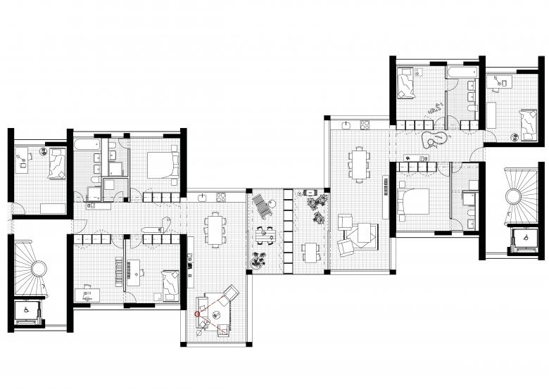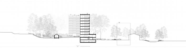 Als Studienauftrag entsteht eine geplante Wohnüberbauung in einer ehemaligen Kiesgrube und bildet trotz stark frequentierten Verkehrswegen eine grüne Oase mit Weiher und Baumkranz. Der gestaffelte Baukörper folgt der Topografie und verbindet Zugang und Parkebene über eine Freitreppe. Offen gegliedert mit Loggien wirkt die Anlage als Ensemble von vier Gebäuden. Vorgartenflächen mit Spiel- und Aufenthaltsbereichen fördern die soziale Qualität im Quartier. Der rückwärtige Park mit Pavillon und Rundweg wird zum gemeinschaftlichen Zentrum. Loftwohnungen im Parkgeschoss sowie flexible Schaltzimmer ermöglichen eine grosse Wohnvielfalt. Die durchgesteckten Wohnungen profitieren von Sonne auf beiden Seiten, ruhiger Lage und Blick ins Grüne. Durch vertikale und horizontale Gliederung sowie unterschiedliche Materialien erhält das Gebäude eine klare Tektonik und angenehme Massstäblichkeit. Holzbauweise, Lehmspeicherwände und Lärmschutzmassnahmen sichern ein gesundes Raumklima und hohe Aufenthaltsqualität.