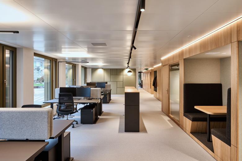 Die Anmutung und Atmosphäre der Filiale widerspiegelt sich auch in der neuen Arbeitswelt der Bank Avera. Das Augenmerk bei der Entwicklung der Büroflächen auf den vier Etagen galt einem flexiblen Nutzungskonzept, das dem heutigen hybriden Arbeiten gerecht wird und den Mitarbeitenden ein diversifiziertes Raumangebot bietet. Die Arbeitsplätze und Meetingräume sind auf allen Stockwerken entlang der grossen Fensterfronten angeordnet. In der Mitte der rundum begehbaren Stockwerke finden sich Besprechungsnischen, Telefonkabinen, Garderobe, Stauraum und die sanitären Einrichtungen. Durchblicke auf die gegenüberliegende Seite des Treppenhauses unterstreichen das grosszügige Raumgefühl. Auf jeder Etage steht den Mitarbeitenden eine Kaffeeküche zur Verfügung, die für die tägliche Verpflegung eingerichtet ist. Die hochwertige Materialisierung, Möblierung und die Farbgebung lehnen sich konsequent an das Filialkonzept an und sorgen für eine einheitliche Wahrnehmung der Werte der Bank Avera.