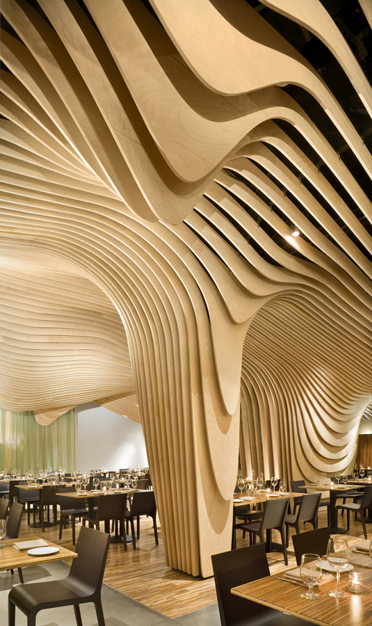 Thus, the entire ceiling is covered by a wood-slatted system that encases and conceals the inherited systems, while offering a large canopy under which to dine. The wood slats are designed as a landscape, undulating in relation to the very equipment they conceal overhead, while encasing the columns in the main hall. The wine storage, in the middle of the hall, serves as another point of support for the ceiling, and acts as a monumental trunk, keeping the canopy aloft. Divided into two segments, the front area on Washington Street is programmed as a bar, while the larger hall behind serves as the dining area. An axial view from the street produces the proscenium from which to view the canopy while lateral views give hints of the structural and mechanical devices being concealed.