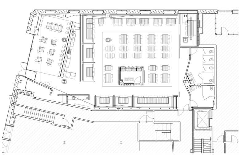 Located in the old Penny Savings Bank, Banq Restaurant capitalizes on the spatial and functional peculiarities of the space as a ground for speculation and invention. Requiring maximum flexibility  on the ground for the re-organization of seating arrangements, in contrast the ceiling is encumbered by the myriad of mechanical, structural, and acoustic limits inherited from the building.