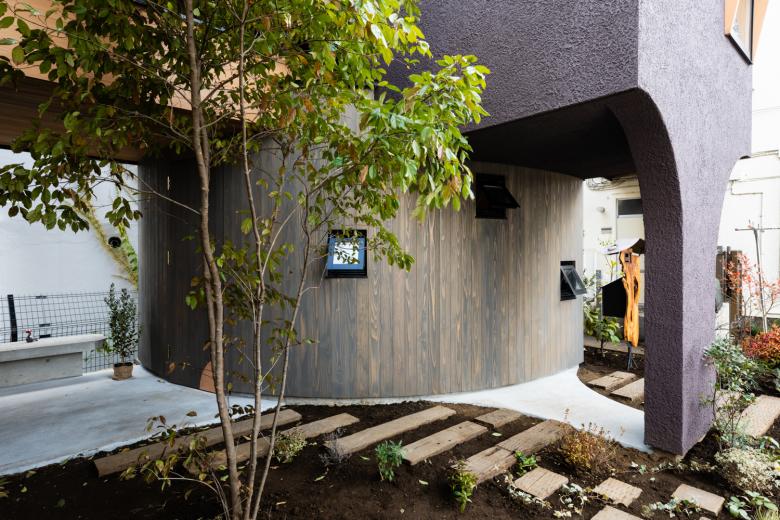 近隣商業地域と一種低層住居地域の狭間にある敷地で、 裏面は高いマンションが建つ旗竿敷地。