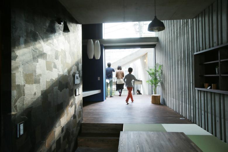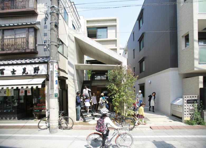 前面道路より。2階まで直接アプローチできるため、家全体が街に開かれたようないろんなイベントに利用されています。