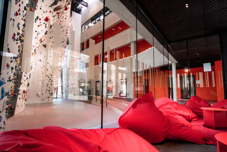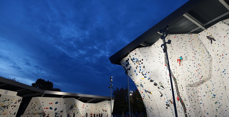 Neubau einer Kletteranlage mit insgesamt 2.150 m² Trainingsfläche, Seminiarräumen, Shop und Bistro. Wettkampfstätte für die Austragung europäischer Challenges in den Disziplinen Lead, Speed und Boulder. Innenliegende Galerien und Sitzstufen im Außengelände ermöglichen die Teilhabe eines größeren Publikums. Ein verglaster Gelenkbau zur bestehenden Kletterhalle ist Bistro und Aufenthaltsbereich.