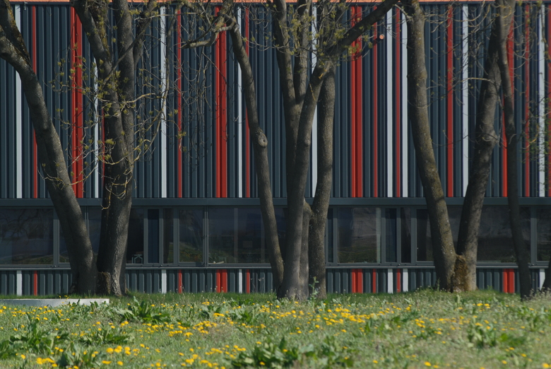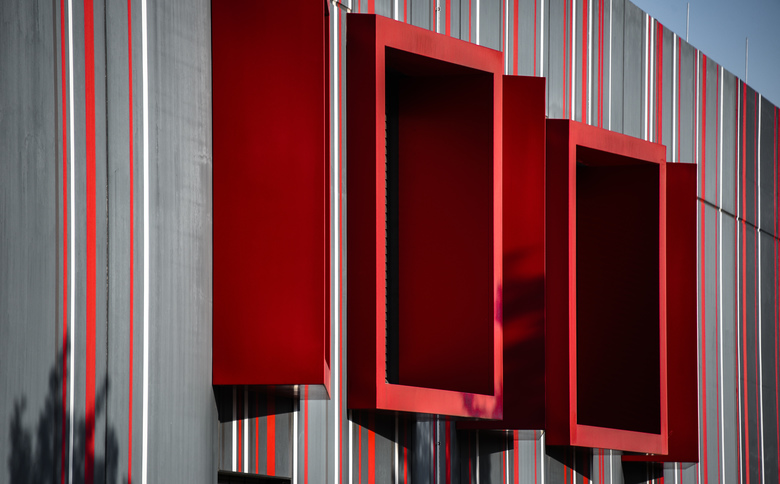 Gewerbebauten wie Messestände bestehen gegenüber der heterogenen Unverbindlichkeit ihrer gebauten Umgebung durch einen leicht verständlichen gestalterischen Ausdruck. Maximale Präsenz und Signifikanz, bei gleichzeitigem Einsatz einfachster Mittel, ohne jedoch dabei laut oder gar beliebig zu werden.Ein Code aus farbigen Streifen verbindet unterschiedliche Nutzungsbereiche und Fassadenkonstruktionen zu einem homogenen Erscheinungsbild. Ein offenes Atrium vor dem Eingang schließt die Fluchten zum kompakten Baukörper.Im Zentrum der Verwaltung transparente Arbeitsbereiche und offene Kommunikationsflächen.