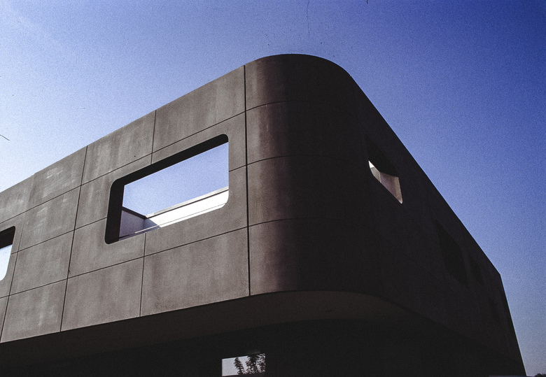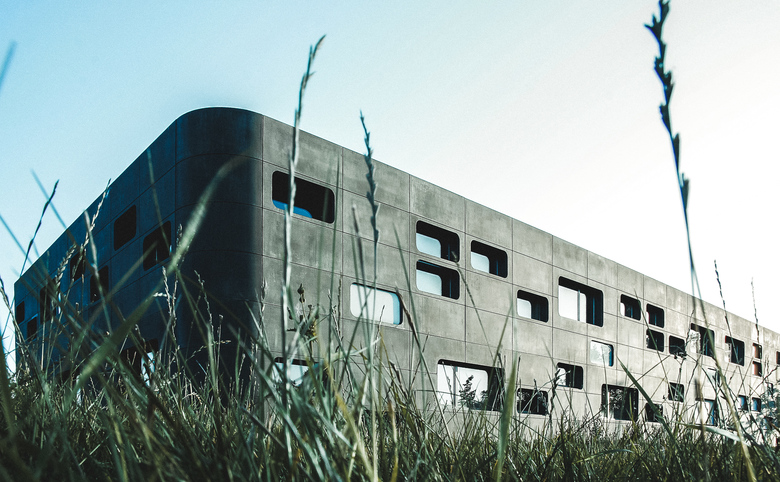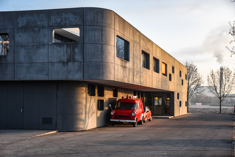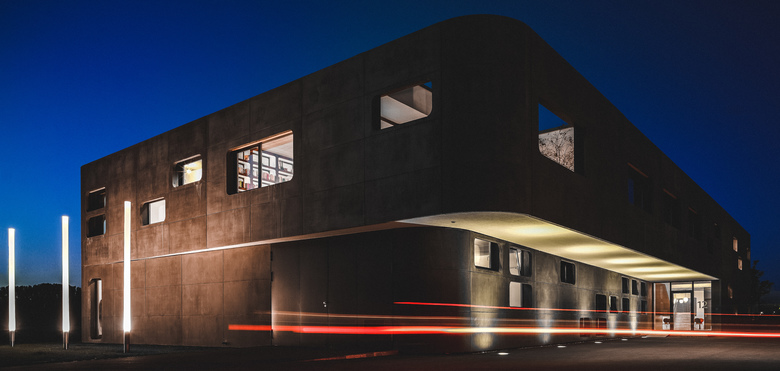 Einem Grenzstein gleich, markiert das Gebäude den nördlichsten Rand des Augsburger Stadtgebietes. Die unregelmäßige Kombination von standardisierten Modulelementen aus schwarz durchfärbtem Sichtbeton verleiht dem strengen Baukörper eine spielerische Fassadenordnung. Mit sichtbarer Solidität positioniert sich das Unternehmen selbstbewusst gegenüber dem heterogenen Allerlei der angrenzenden Industriebauten.