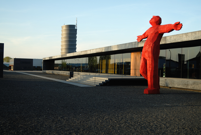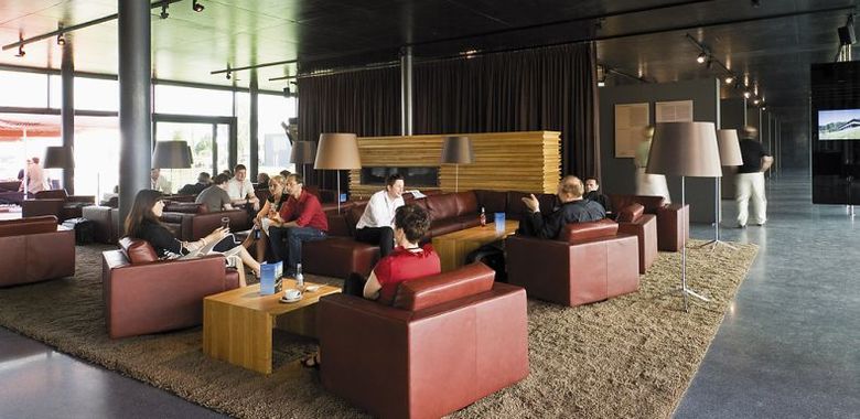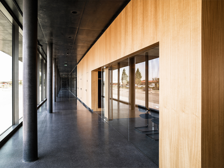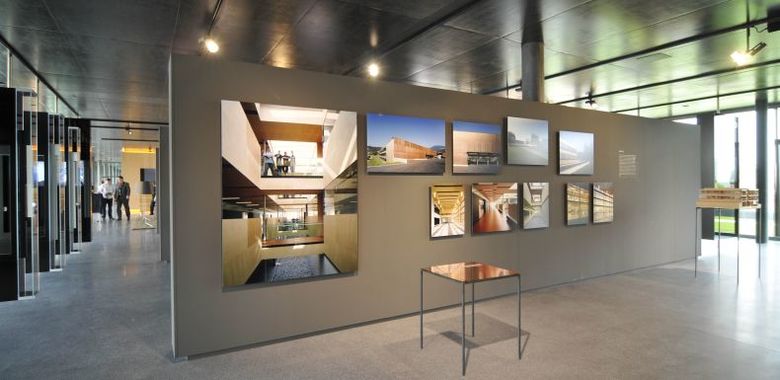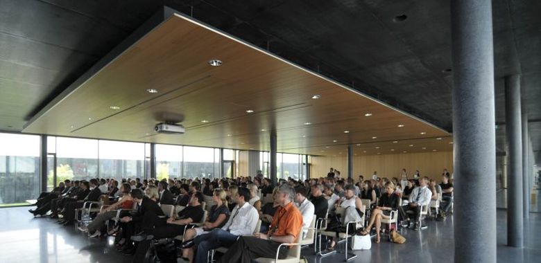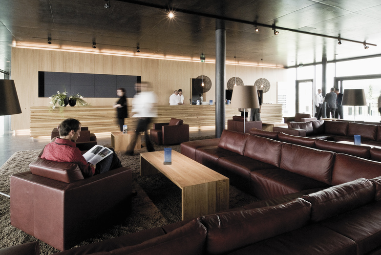 Vortragssäle, Schulungsräume und Ausstellungsbereiche ergänzen sich übergangslos mit einer ausladenden KundenLounge mit Kaminfeuer und PianoBar. Alle konstruktiven Elemente des Bauwerks sind aus schwarz pigmentiertem Sichtbeton gegossen. Die regenerative Bauwerksklimatisierung erfolgt ausschließlich über grundwassergespeiste Betonkernaktivierung.